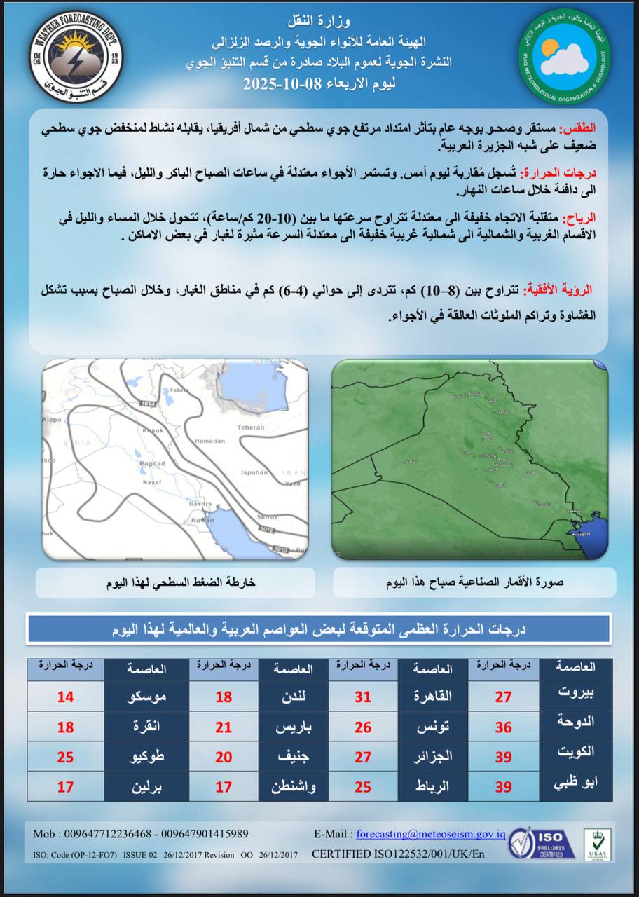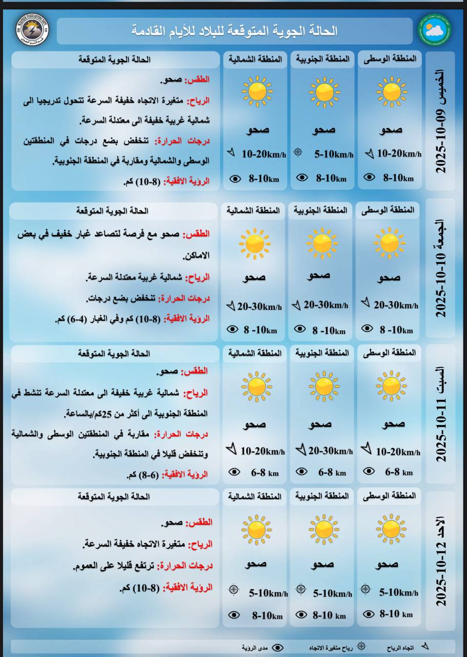 ، اليوم الأربعاء، حالة الطقس في البلاد خلال الأيام الأربعة المقبلة، مبينة ان الطقس سيشهد انخفاضاً يتبعه ارتفاع بدرجات الحرارة وتصاعداً للغبار.