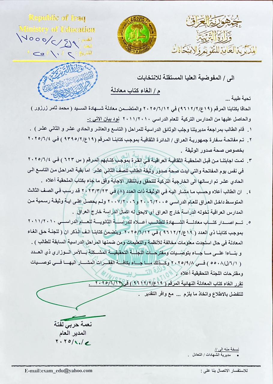 النزاهة والمفوضية تتفقان على تزوير "زرزور" وتبعثان بكتاب للهيئة القضائية (وثيقة)