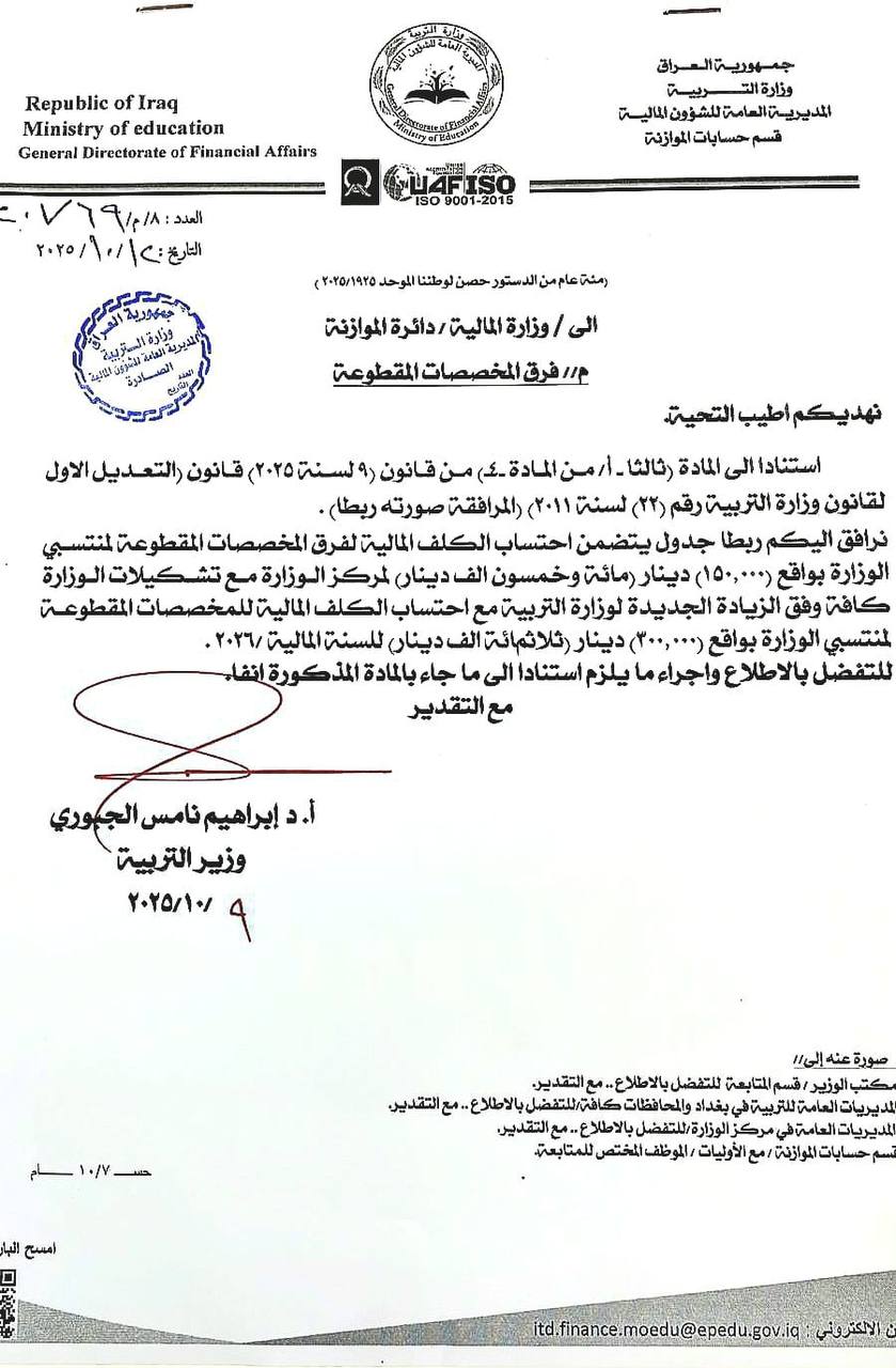 نظيرته المالية، لاحتساب الكلف المالية لفرق المخصصات المقطوعة لمنتسبي الوزارة بواقع (١٥٠،٠٠٠) ألف دينار على وفق الزيادة الجديدة مع احتساب الكلف المالية للمخصصات المقطوعة بواقع (۳۰۰,۰۰۰) دينار ثلاثمائة الف دينار للسنة المالية /٢٠٢٦، وذلك بعد الحصول على الموافقات الاصولية من السلطة التشريعية والتنفيذية، في خطوة نوعية تهدف الى تحقيق العدالة الوظيفية وانصاف الشريحة التربوية".