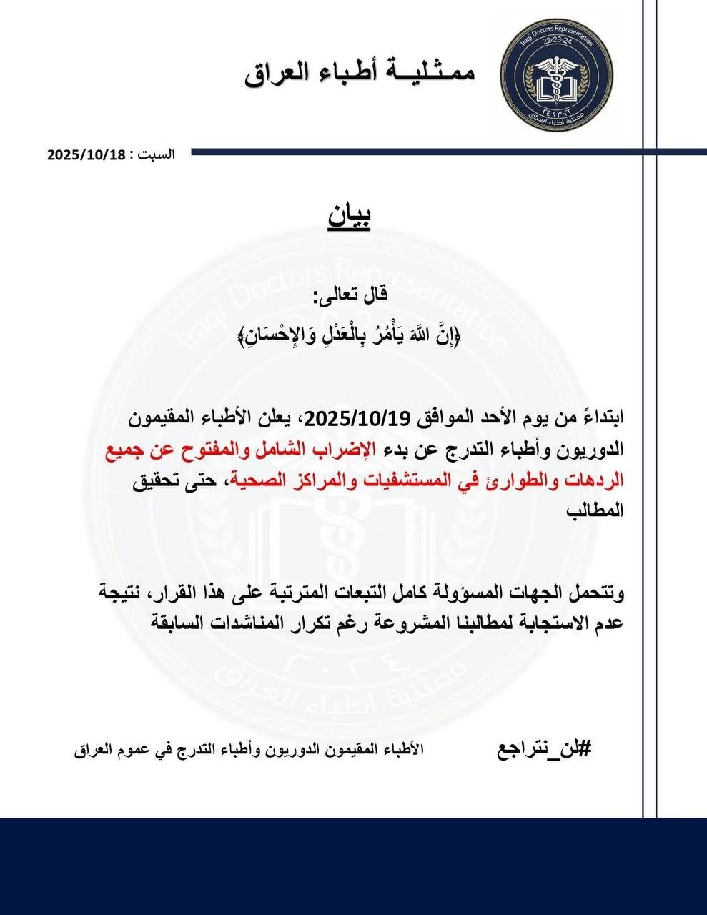 وذكر بيان للمثلية، انه "ابتداءً من يوم الأحد الموافق 2025/10/19 ، يعلن الأطباء المقيمون الدوريون وأطباء التدرج عن بدء الإضراب الشامل والمفتوح عن جميع الردهات والطوارئ في المستشفيات والمراكز الصحية، حتى تحقيق المطالب".