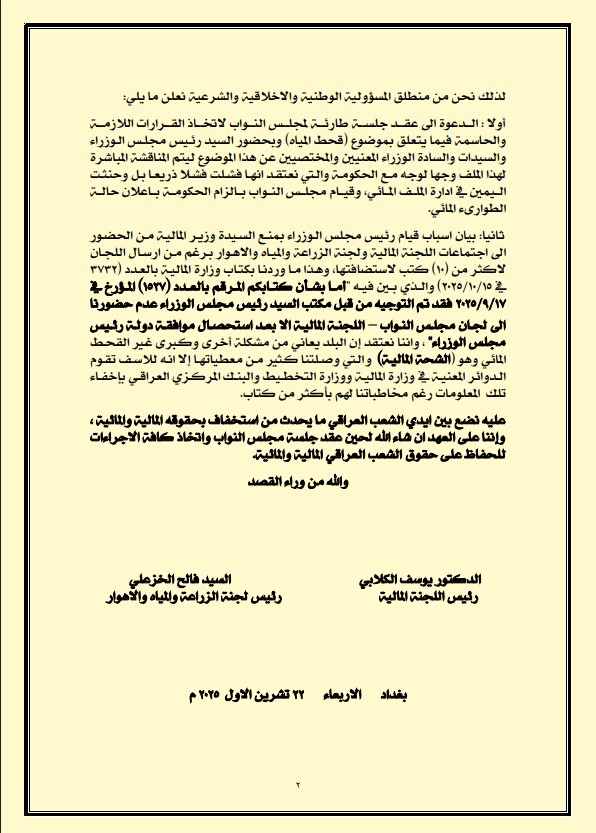 -الدعوة الى عقد جلسة طارئة لمجلس النواب لاتخاذ القرارات اللازمة والحاسمة فيما يتعلق بموضوع (قحط المياه وبحضور رئيس مجلس الوزراء والوزراء المعنيين والمختصيين عن هذا الموضوع ليتم المناقشة المباشرة لهذا الملف وجها لوجه مع الحكومة والتي نعتقد انها فشلت فشلا ذريعا بل وحنثت اليمين في ادارة الملف المائي، وقيام مجلـس النـواب بـالزام الحكومة باعلان حالة الطوارىء المائي.