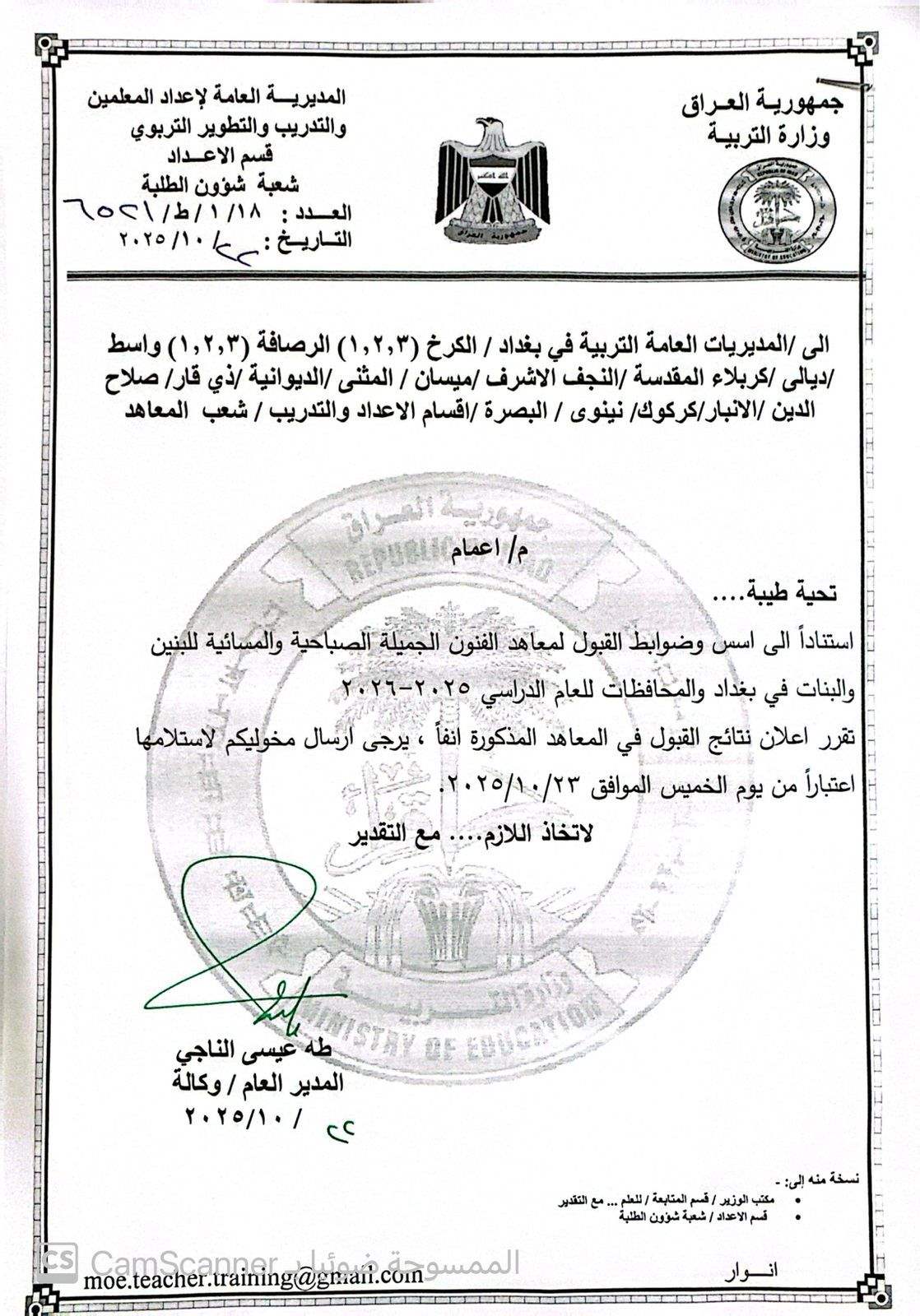 ودعت الوزارة، إلى "مراجعة ادارات المعاهد التي تم التقديم لها للاطلاع على أسماء المقبولين وتعليمات استكمال إجراءات التسجيل".