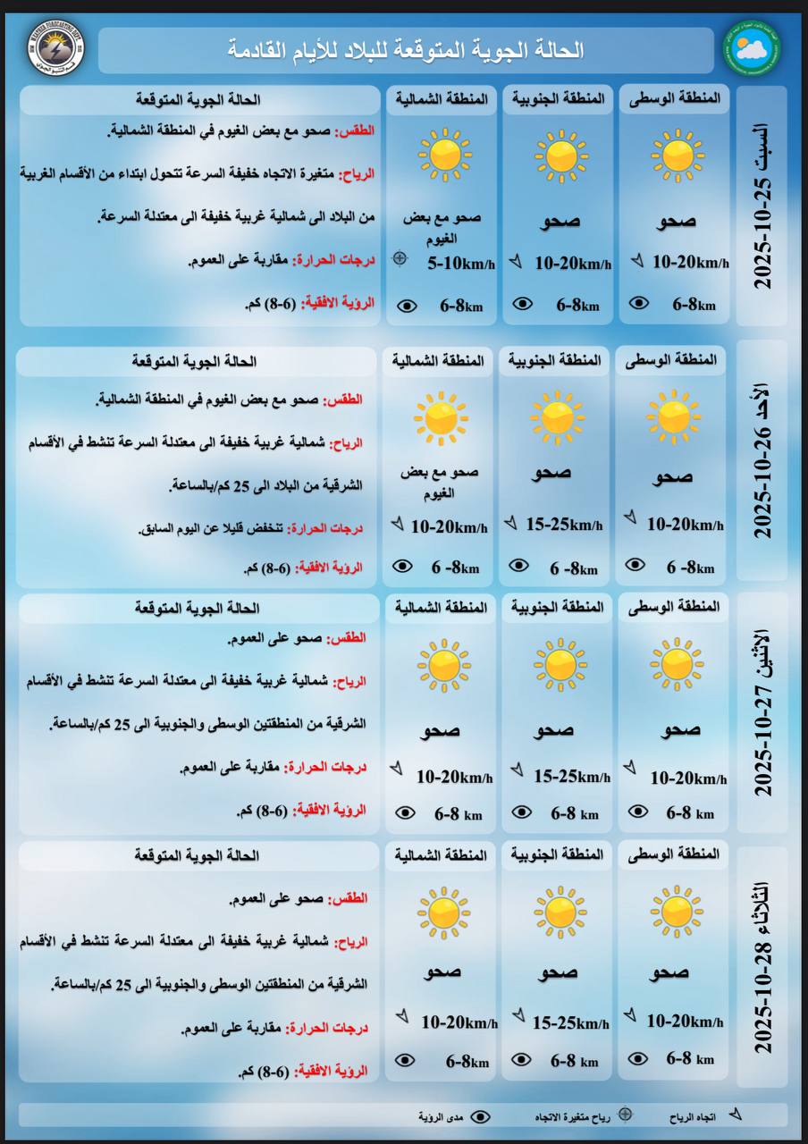 وذكر أن "طقس يومي الاثنين والثلاثاء سيكون صحواً في عموم المناطق، والرياح شمالية غربية خفيفة الى معتدلة السرعة تنشط في الاقسام الشرقية من المنطقتين الوسطى والجنوبية الى 25 كم/ بالساعة، ودرجات الحرارة مقاربة بعموم المناطق".