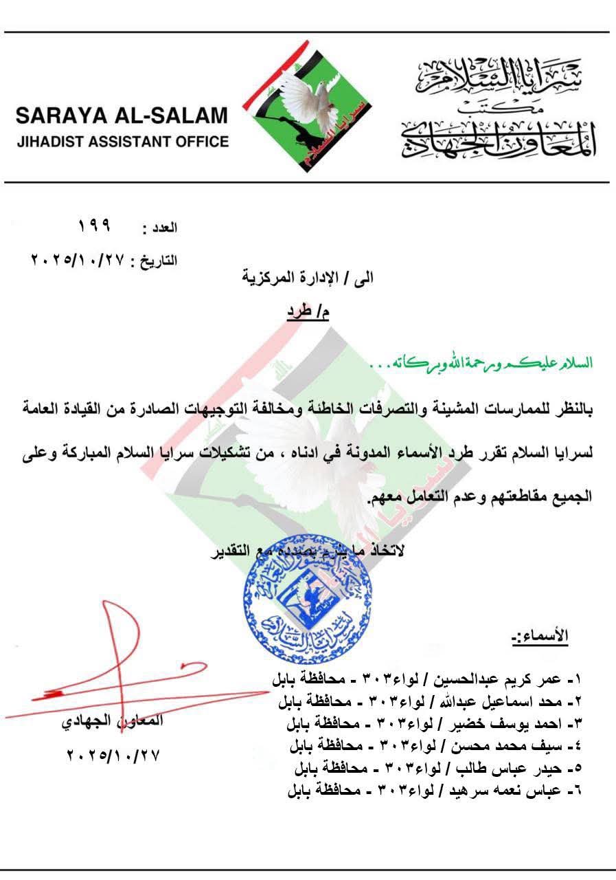 لسرايا السلام، تقرر طرد الأسماء المدونة في ادناه، من تشكيلات سرايا السلام