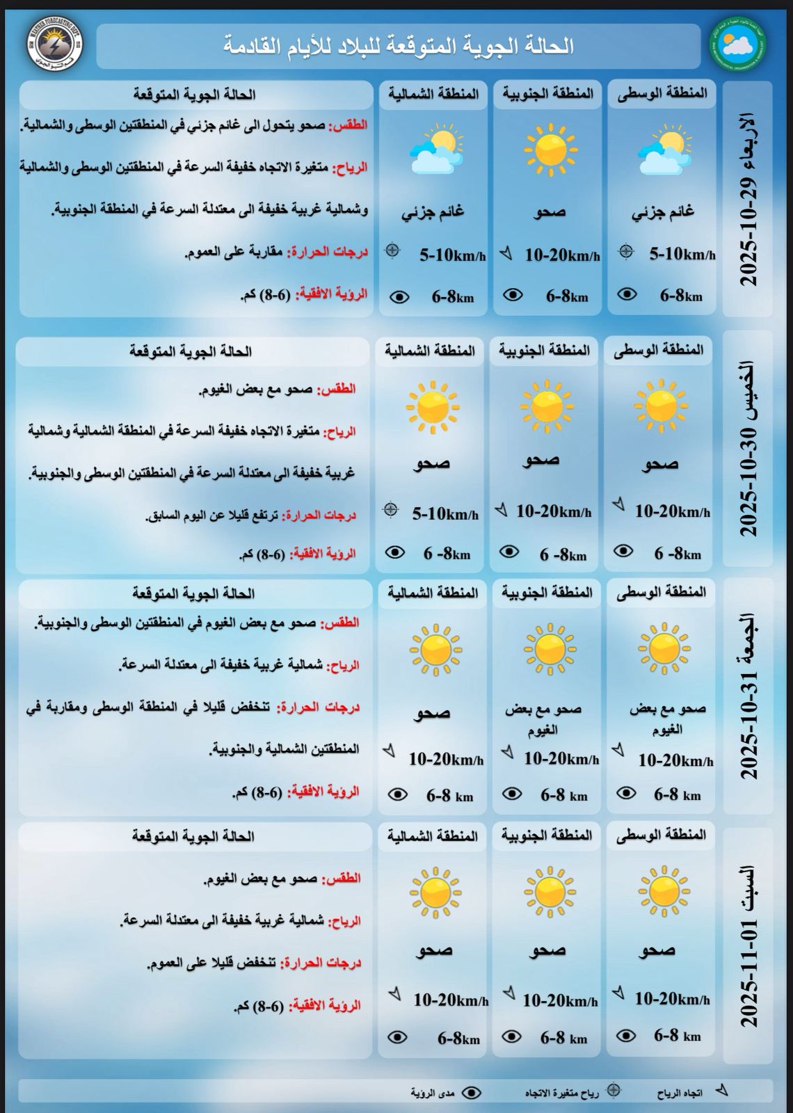 ، ان "طقس يوم غد الأربعاء سيكون صحوا يتحول الى غائم جزئي في المنطقتين الوسطى والشمالية ودرجات الحرارة مقاربة لليوم السابق على العموم"، مبينة ان "طقس الخميس المقبل سيكون صحوا على العموم ودرجات الحرارة ترتفع قليلا عن اليوم السابق".