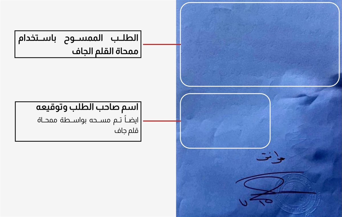 وتظهر اثار لنص طلب مكتوب بخط اليد وهامش المواطن الذي قدم الطلب اذ تم محوهما والابقاء على هامش وزير التربية وختمه وتوقيعه.
