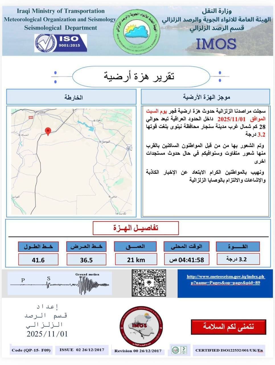 وذكر القسم في بيان ورد للسومرية نيوز، انه "تم تسجيل هزة أرضية بقوة (3,2) في