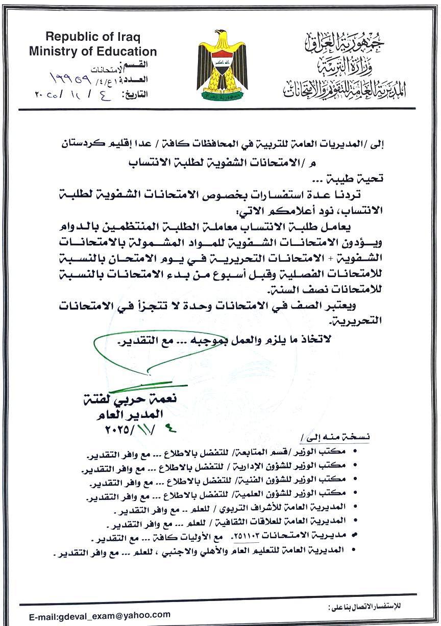 للتقويم والامتحانات توضح آلية اداء الامتحانات الشفوية بالنسبة لطلبة الانتساب وتؤكد شمولهم بالامتحانات للمواد المشمولة (الشفوية + التحريرية) في يوم