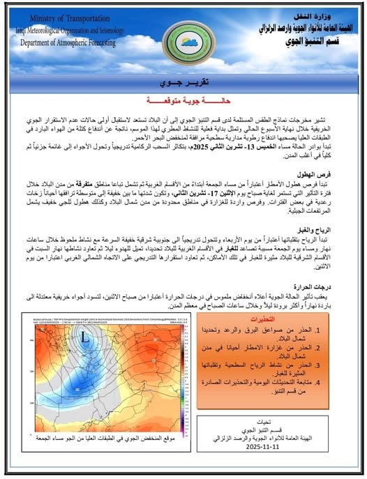 وجاء في تقرير لقسم التنبؤ الجوي عن حالة جوية ممطرة متوقعة تبدأ مساء يوم الجمعة المقبل وتنتهي يوم الاثنين 17 تشرين الثاني الحالي.