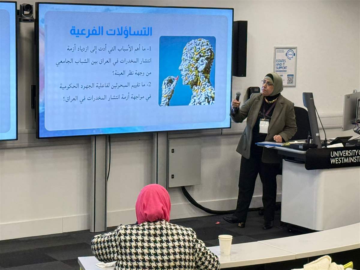 من بغداد إلى لندن.. السراج تطرح أزمة المخدرات وتأثيرها على الشباب الجامعي في مؤتمر العلوم الإنسانية