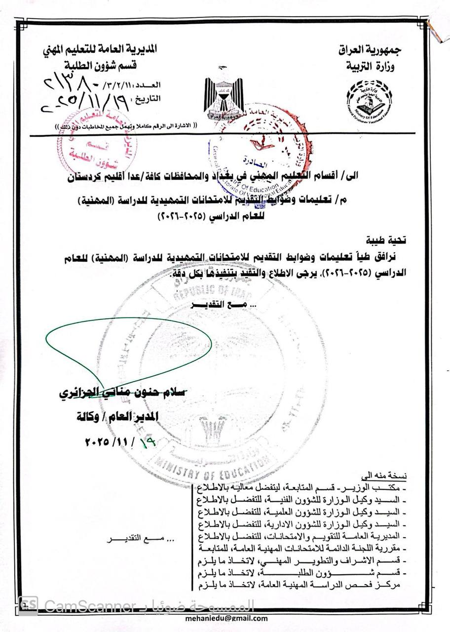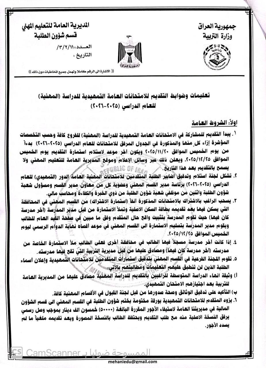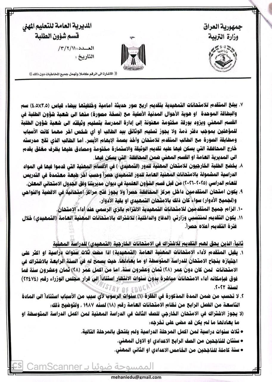 ، اليوم الأربعاء، عن ضوابط وتعليمات الاشتراك في الامتحانات التمهيدية المهنية (الخارجي) للعام الدراسي 2025 – 2026.