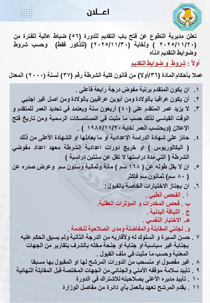 وتضنمت الضوابط والشروط 11 فقرة منها أن يكون المتقدم برتبة مفوض درجة رابعة فأعلى، ولا يزيد عمره عن 40 عاما.