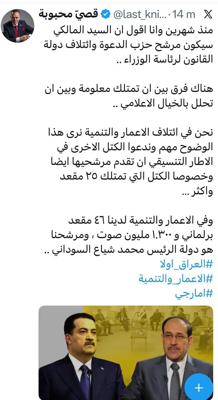 الاعمار والتنمية: السوداني هو مرشحنا لرئاسة الوزراء