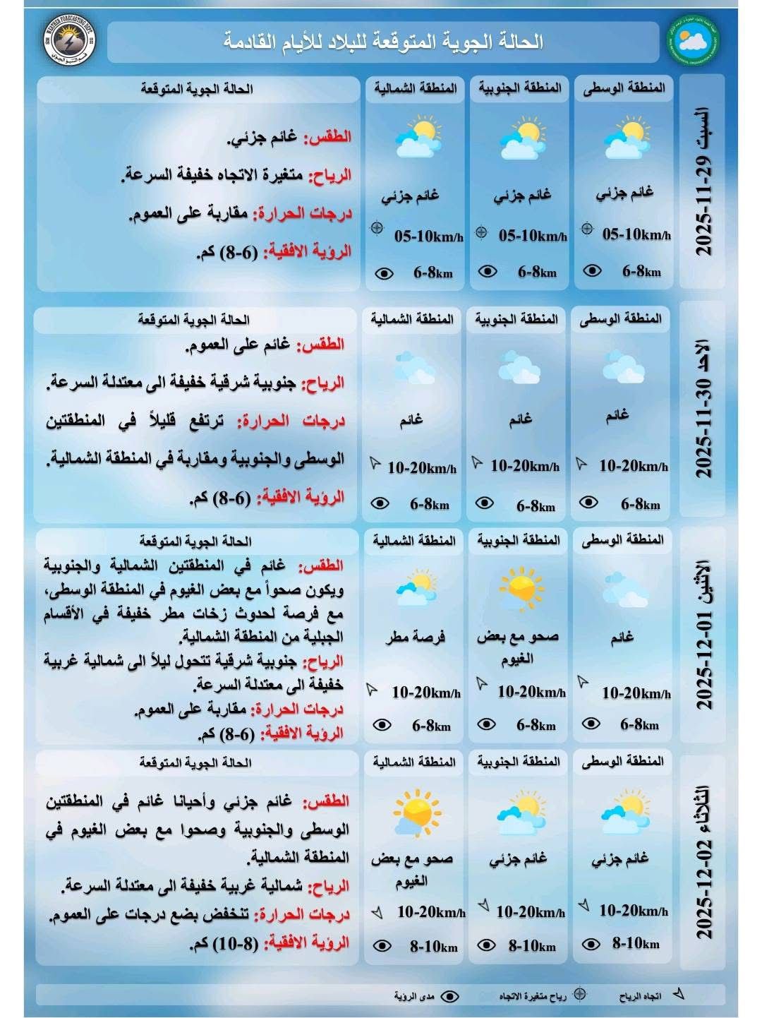 وتابعت ان "طقس يوم الاثنين المقبل سيكون غائما في المنطقتين الشمالية والجنوبية وصحوا مع بعض الغيوم في المنطقة الوسطى مع فرصة لتساقط زخات مطر خفيفة في الأقسام الجبلية من المنطقة الشمالية ودرجات الحرارة مقاربة لليوم السابق"، موضحة ان "طقس الثلاثاء المقبل سيكون غائما جزئيا واحيانا غائما في المنطقتين الوسطى والجنوبية وصحوا مع بعض الغيوم في المنطقة الشمالية ودرجات الحرارة تنخفض بضع درجات في عموم البلاد".