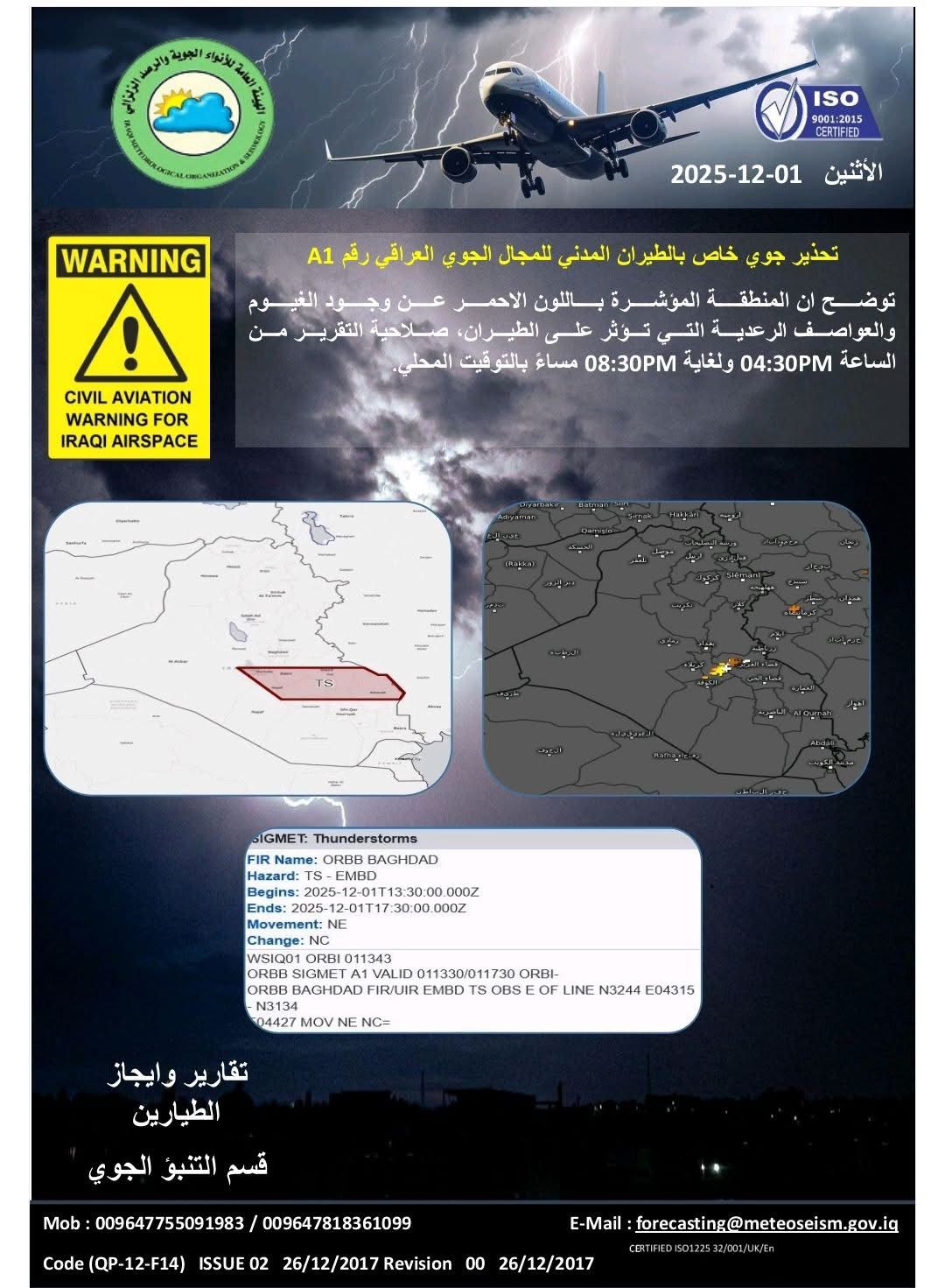 في هيئتنا اصدر تحذيرا جويا خاصا بالطيران حول وجود سحب ركامية رعدية في المكان المحدد على الخريطة".