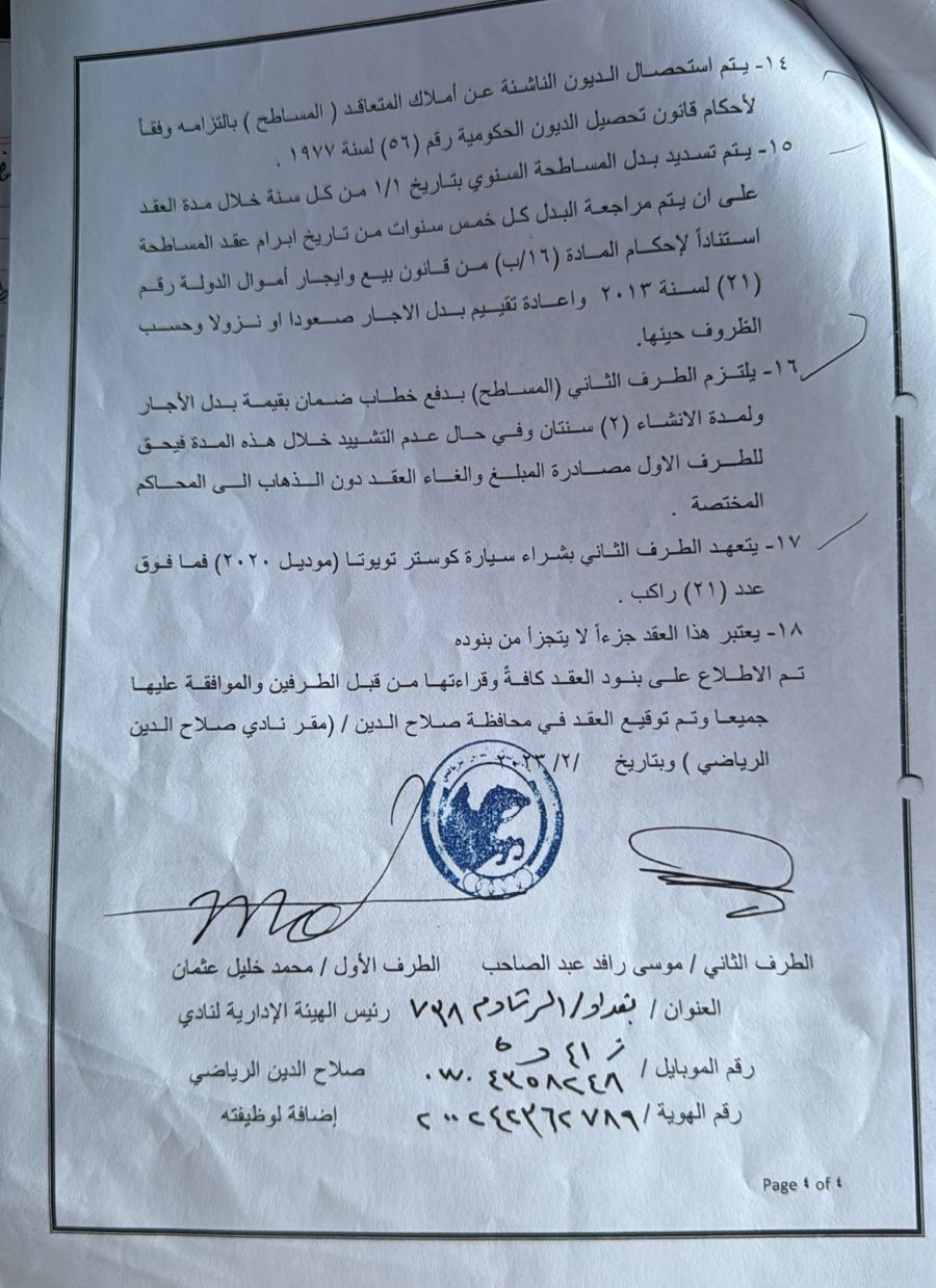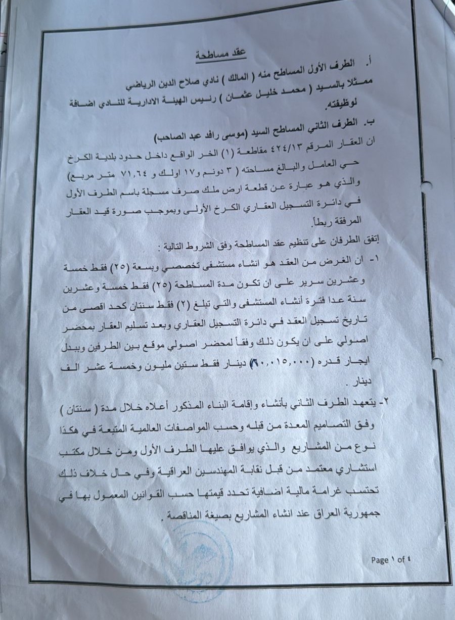 عثمان رئيس الهيئة الإدارية للنادي؛ وبين المستثمر (موسى رافد عبد الصاحب) بصفته الطرف الثاني (المُساطَح له).