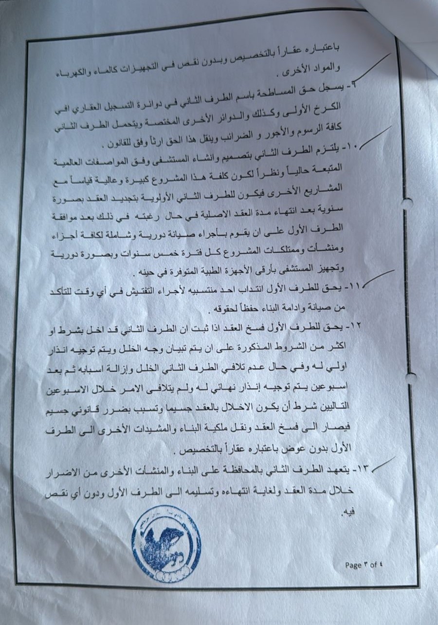 وتُظهر وثيقة "عقد المساطحة" المبرمة أن المشروع يتعلق بإنشاء مستشفى تخصصي بسعة (25) سريراً على قطعة أرض داخل حدود بلدية
