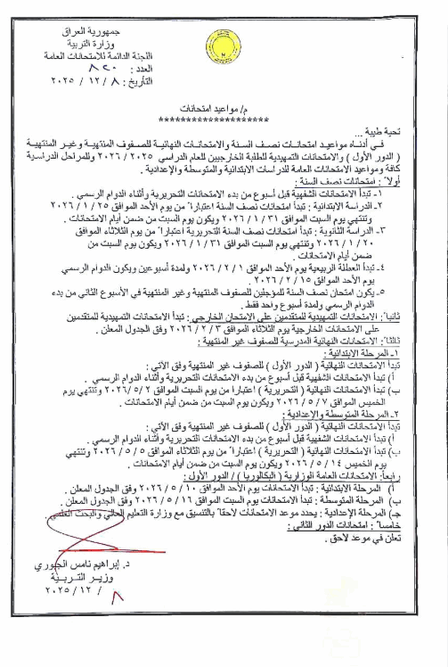 للامتحانات العامة تعلن مواعيد امتحانات نصف السنة والامتحانات النهائية للصفوف المنتهية وغير المنتهية ( الدور الأول ) والامتحانات التمهيدية للطلبة الخارجيين للعام الدراسي 2025_2026 وللمراحل الدراسية كافة".
