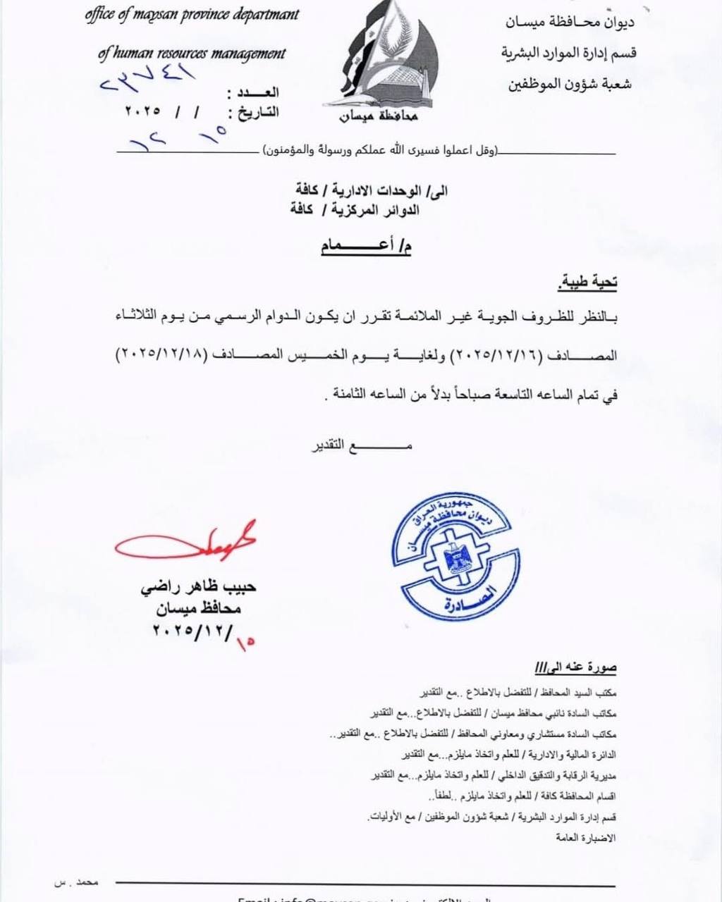 ، انه "تقرر تقليص الدوام الرسمي في الدوائر والمؤسسات الحكومية في المحافظة ليكون بدء الدوام من الساعة التاسعة صباحاً بدلاً من الساعة الثامنة لمدة ثلاثة أيام اعتباراً من يوم غد الثلاثاء الموافق 2025/12/16 ولغاية يوم الخميس المقبل الموافق 2025/12/18".