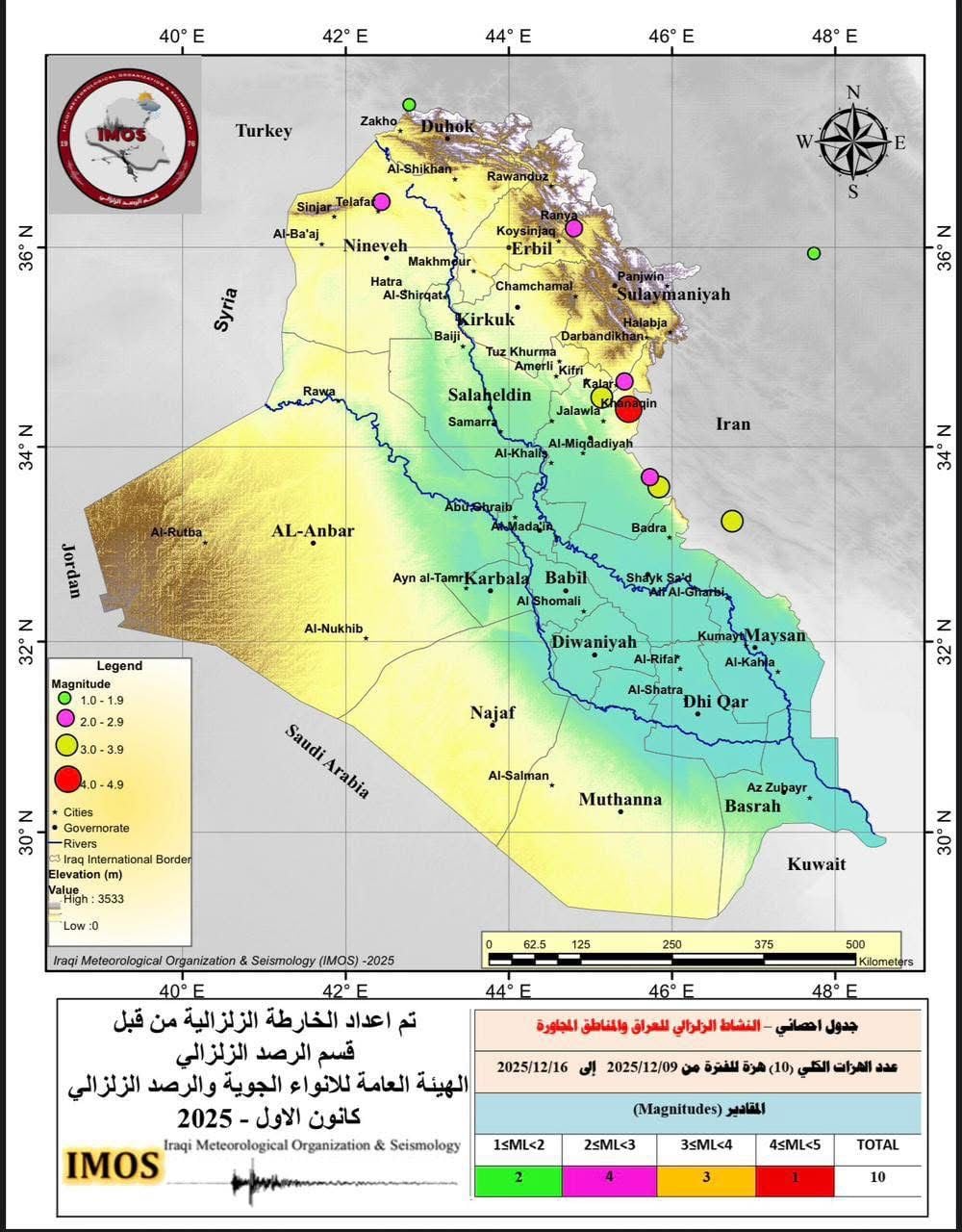 ووفقا لقسم الرصد فأنه "سجل 10 هزات أرضية للفترة من 9-16 كانون الأول الحالي"، مبينا ان "سبعة منها حدثت داخل