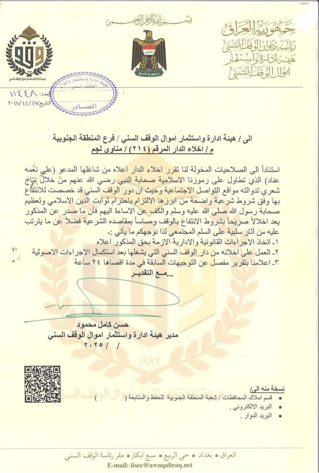 2ـ العمل على اخلائه من دار الوقف السني التي يشغلها بعد استكمال الاجراءات الأصولية