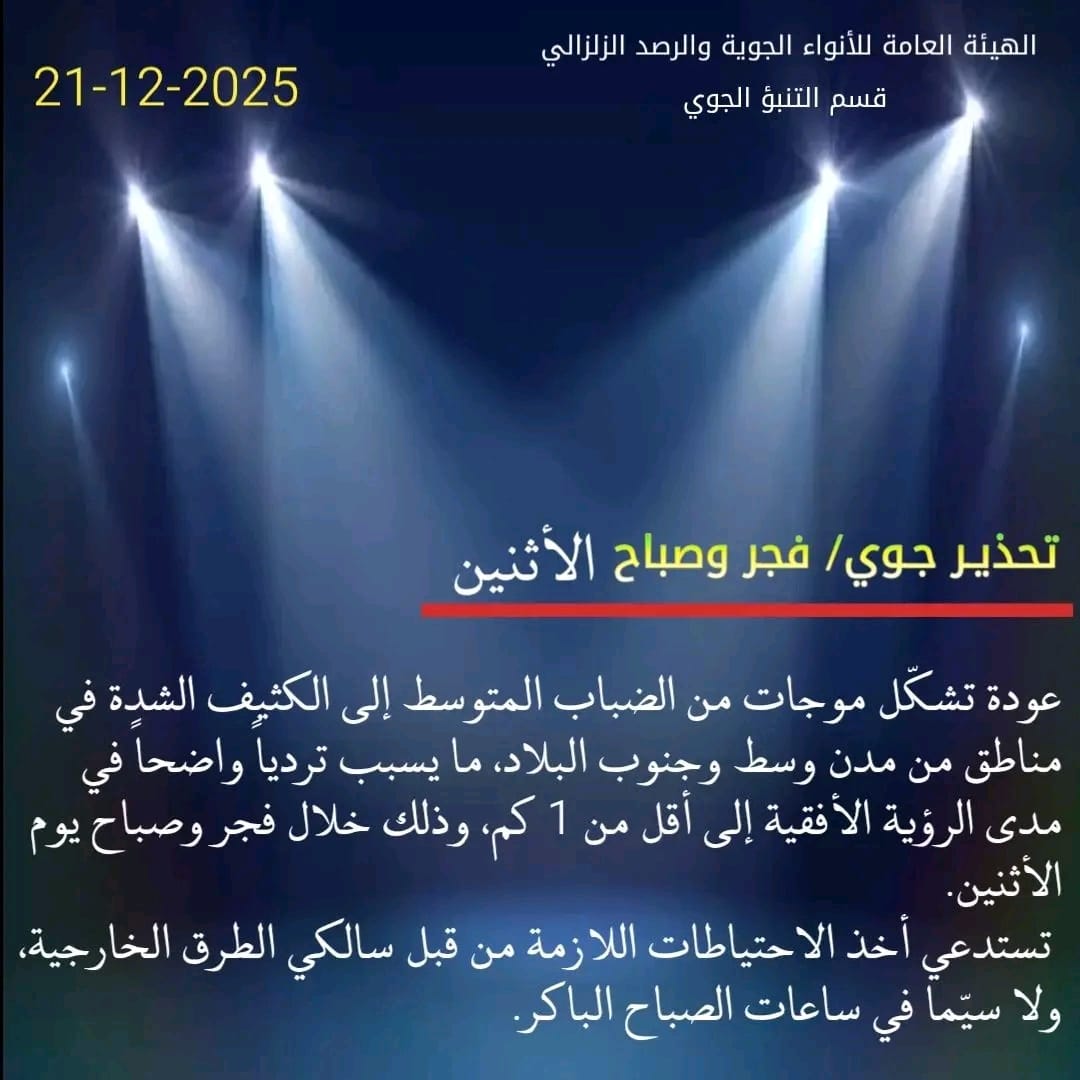 ، ان "موجات من الضباب المتوسط إلى الكثيف الشدة في ستعود تتشكل في مناطق من وسط وجنوب البلاد، ما يسبب ترديا واضحا في مدى الرؤية الأفقية إلى أقل من 1 كم، وذلك خلال فجر وصباح يوم الاثنين".