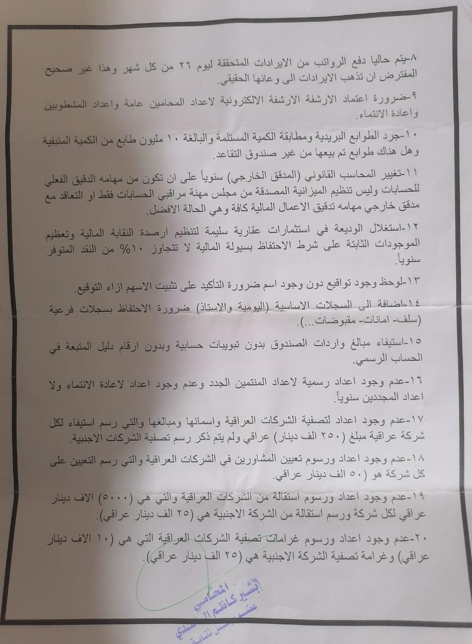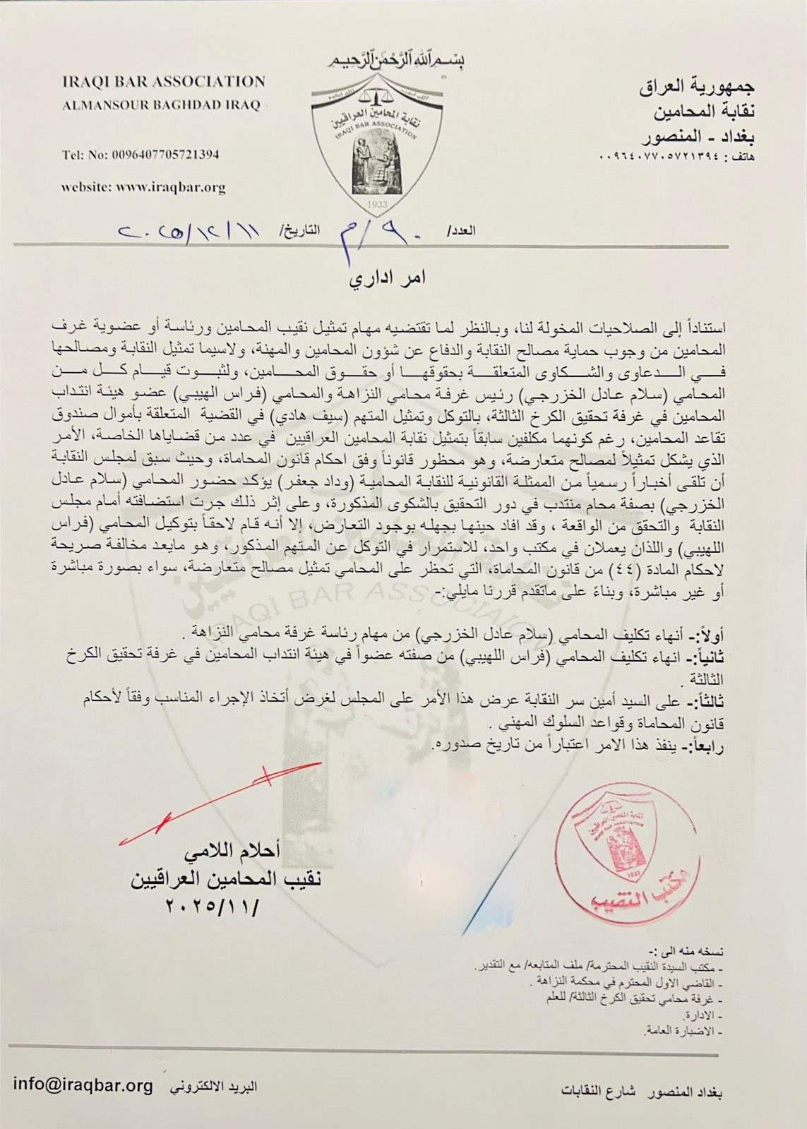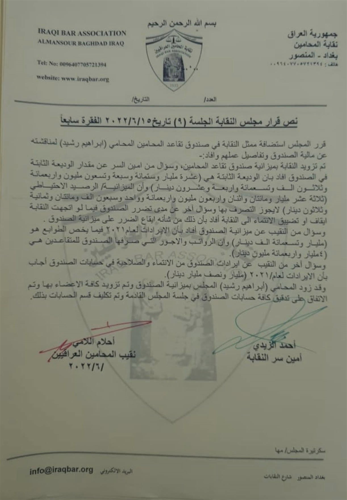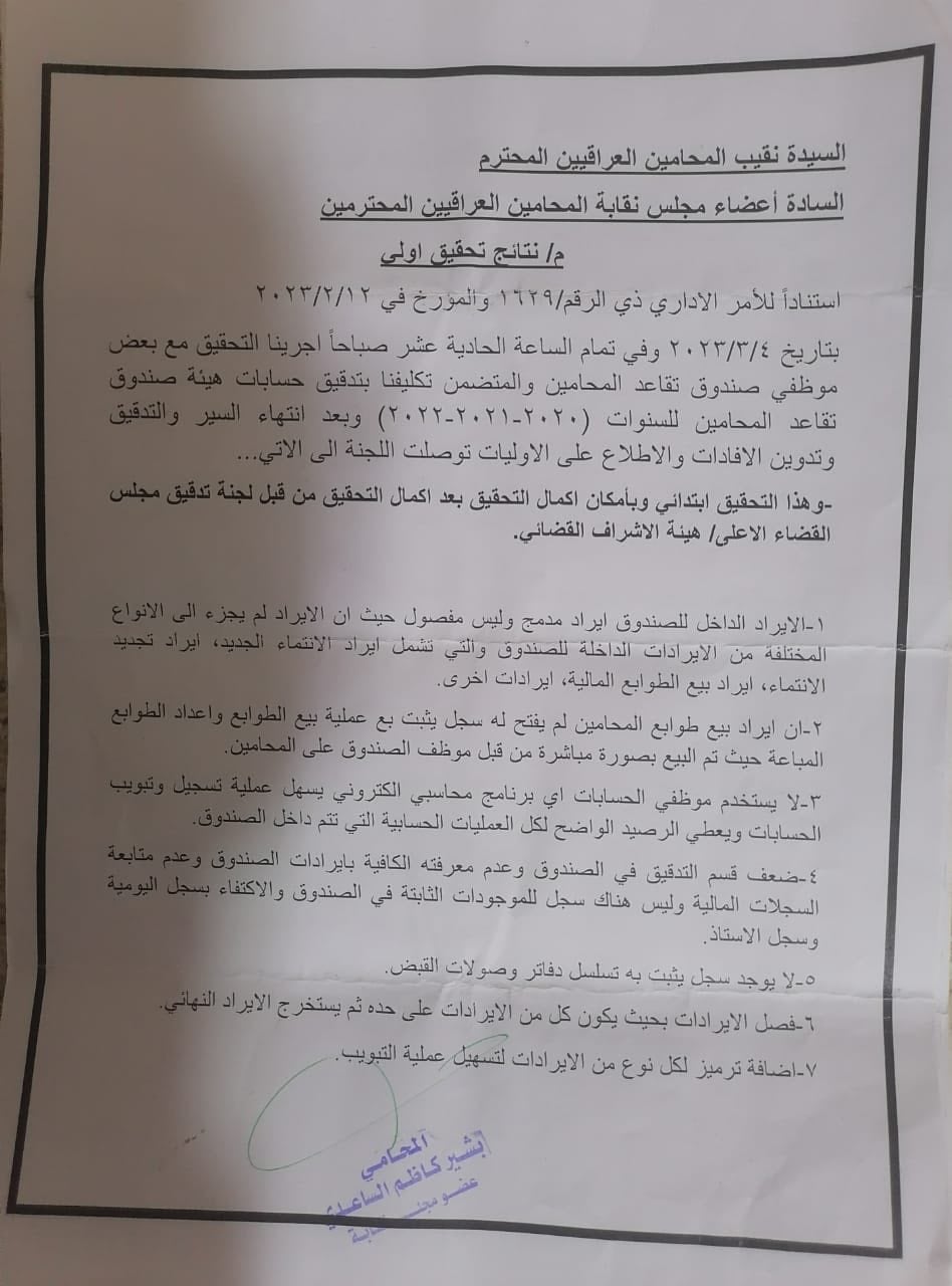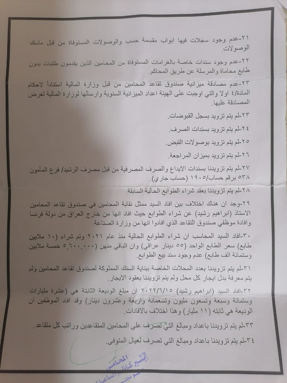 تقاعد المحامين العراقيين خلال الفترة بين 2019 و2022، أسفرت عن اختلاس أكثر من 20 مليار دينار عراقي، مشيراً إلى أن هذه المخالفات تمثل تهديداً مباشرًا لحقوق المحامين التقاعدية.