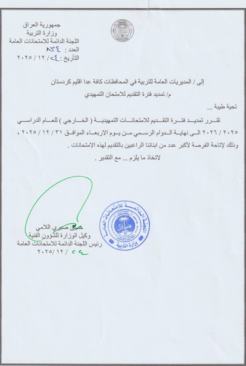 للتقويم والامتحانات تعلن الموافقة على تمديد فترة التقديم للامتحانات التمهيدية (الخارجي) ، الى نهاية الدوام الرسمي ليوم الاربعاء الموافق 31/12/2025".