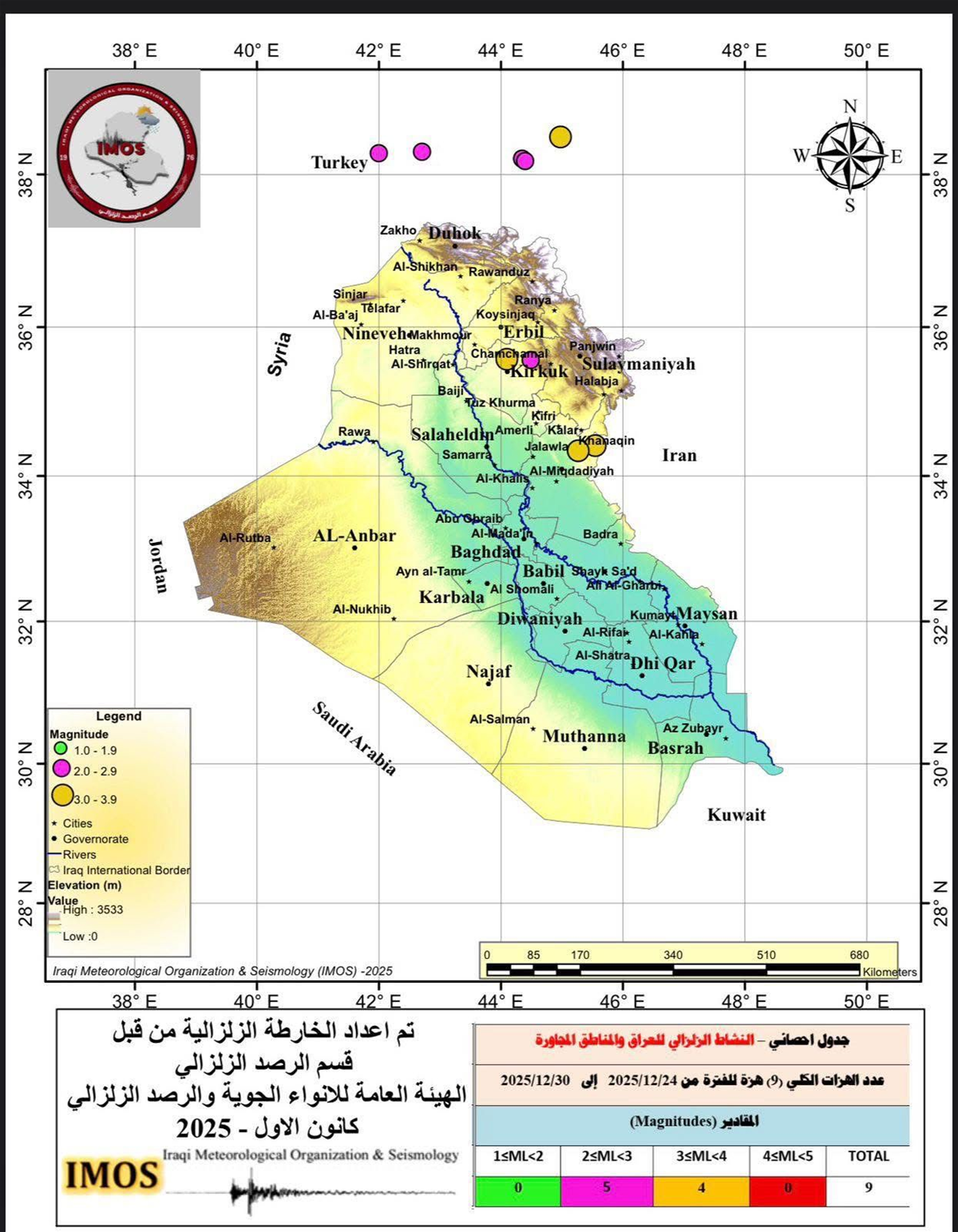 ، انه "تم تسجيل 9 هزات أرضية للفترة من 24 كانون الأول الحالي ولغاية اليوم الثلاثاء".
