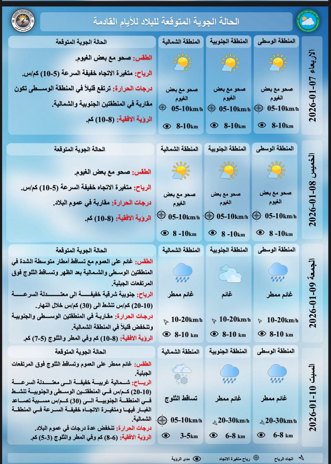 "، مشيرة الى ان "طقس السبت القادم سيكون غائماً ممطراً على العموم وتساقط الثلوج فوق المرتفعات الجبلية، مع تصاعد الغبار ودرجات الحرارة تنخفض عدة درجات في عموم البلاد".