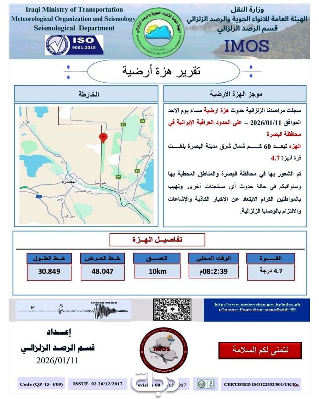 بلغت قوة الهزة 4.7 وتم الشعور بها في محافظة البصرة والمناطق المحيطة بها".