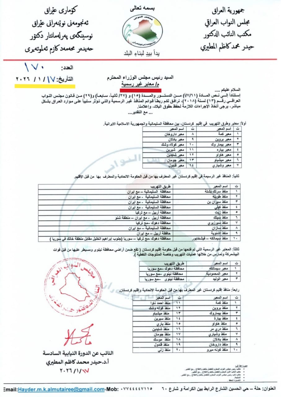 ، بموجب الوثيقة المؤرخة في 17 كانون الثاني 2026، بضرورة التدخل لوقف نشاط معابر وطرق تهريب غير قانونية تؤثر سلباً على موارد