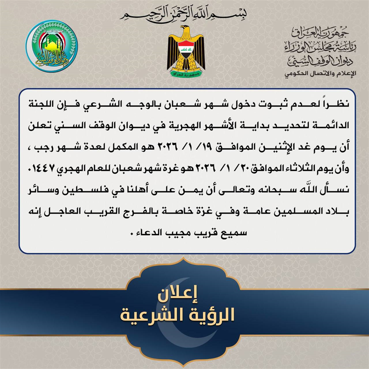 تعلن أن يوم غد الإثنين الموافق ١/١٩/ ٢٠٢٦ هو المكمل لعدة شهر رجب، وأن يوم الثلاثاء الموافق ٢٠ / ١ / ٢٠٢٦ هو غرة شهر شعبان للعام الهجري ١٤٤٧هـ".