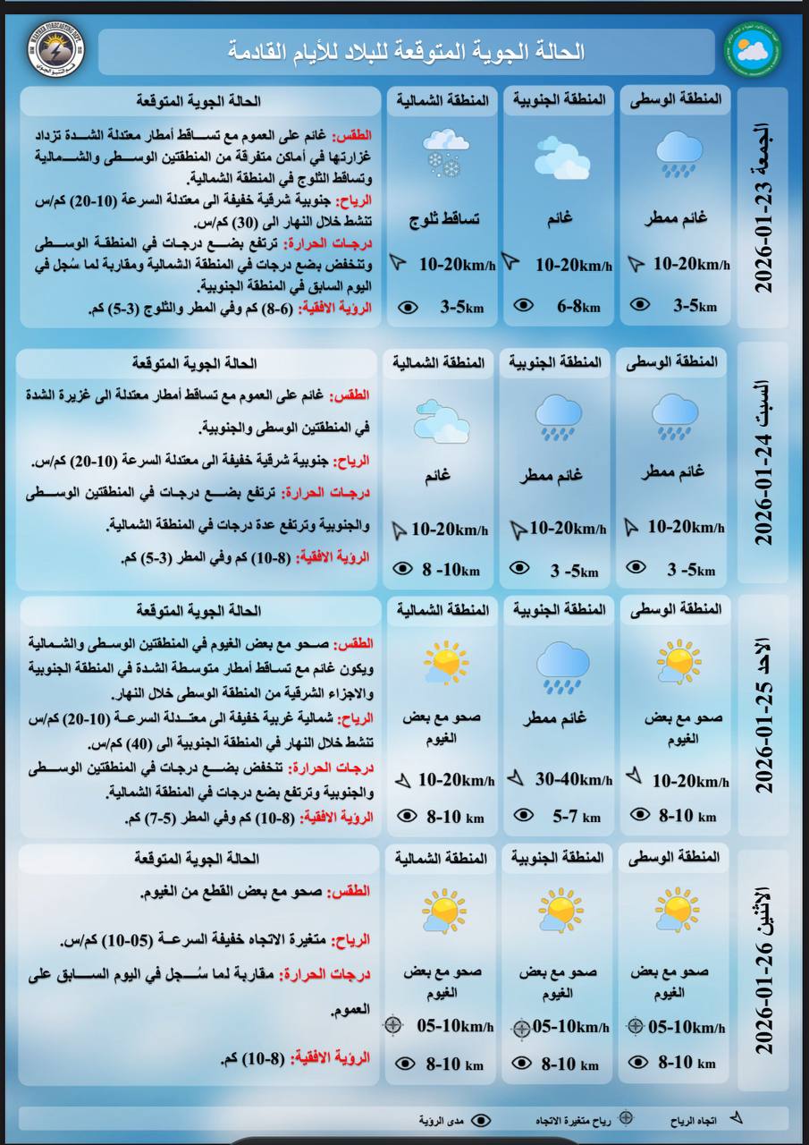 أعلنت هيئة الأنواء الجوية، اليوم الخميس، تفاصيل حالة الطقس في البلاد للأيام المقبلة، فيما توقعت تساقطاً للأمطار والثلوج وارتفاعاً في درجات الحرارة حتى الأحد المقبل.