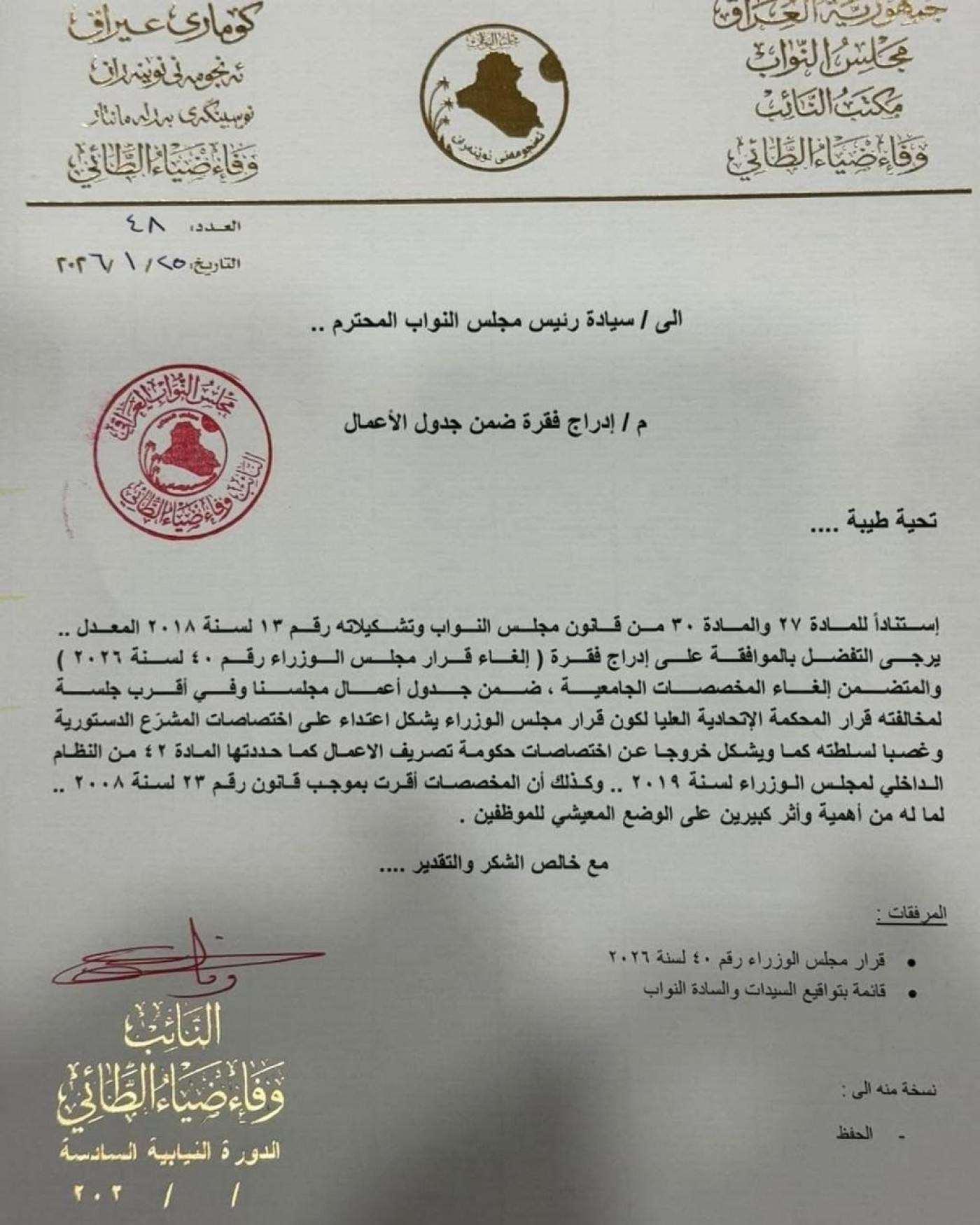 ووفقاً لكتاب رسمي وجهته النائب