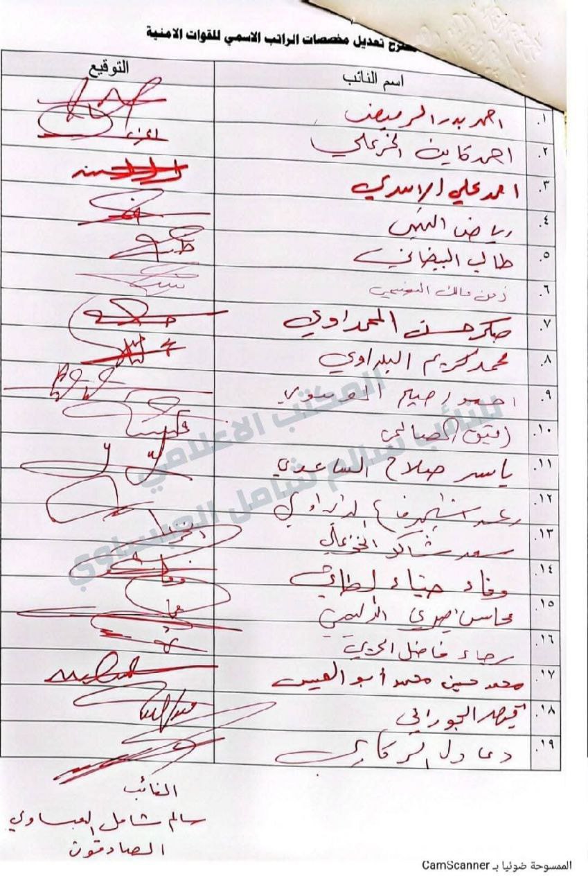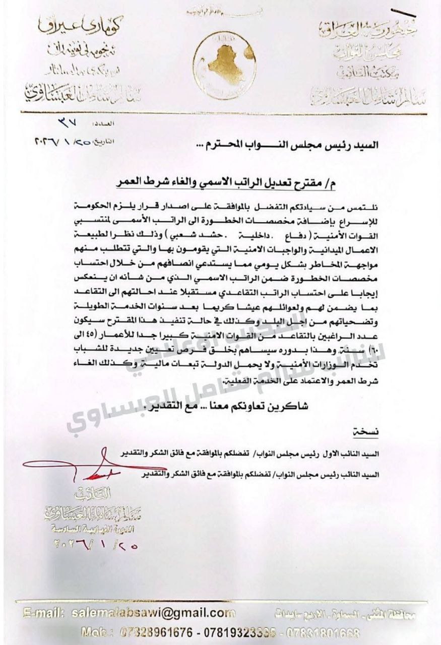 ، انه "وفاءً للعهود التي قطعها للقوات الامينة قبل ترشحه للانتخابات البرلمانية، قدمنا طلب رسمي إلى رئاسة مجلس النواب، مدعوماً بعددٍ من تواقيع النواب، يتضمن مقترح تعديل وإضافة مخصصات الخطورة إلى الراتب الاسمي، إلى جانب إلغاء شرط العمر والاعتماد على الخدمة الفعلية لمنتسبي القوات الأمنية (الدفاع، الداخلية، الحشد الشعبي)".