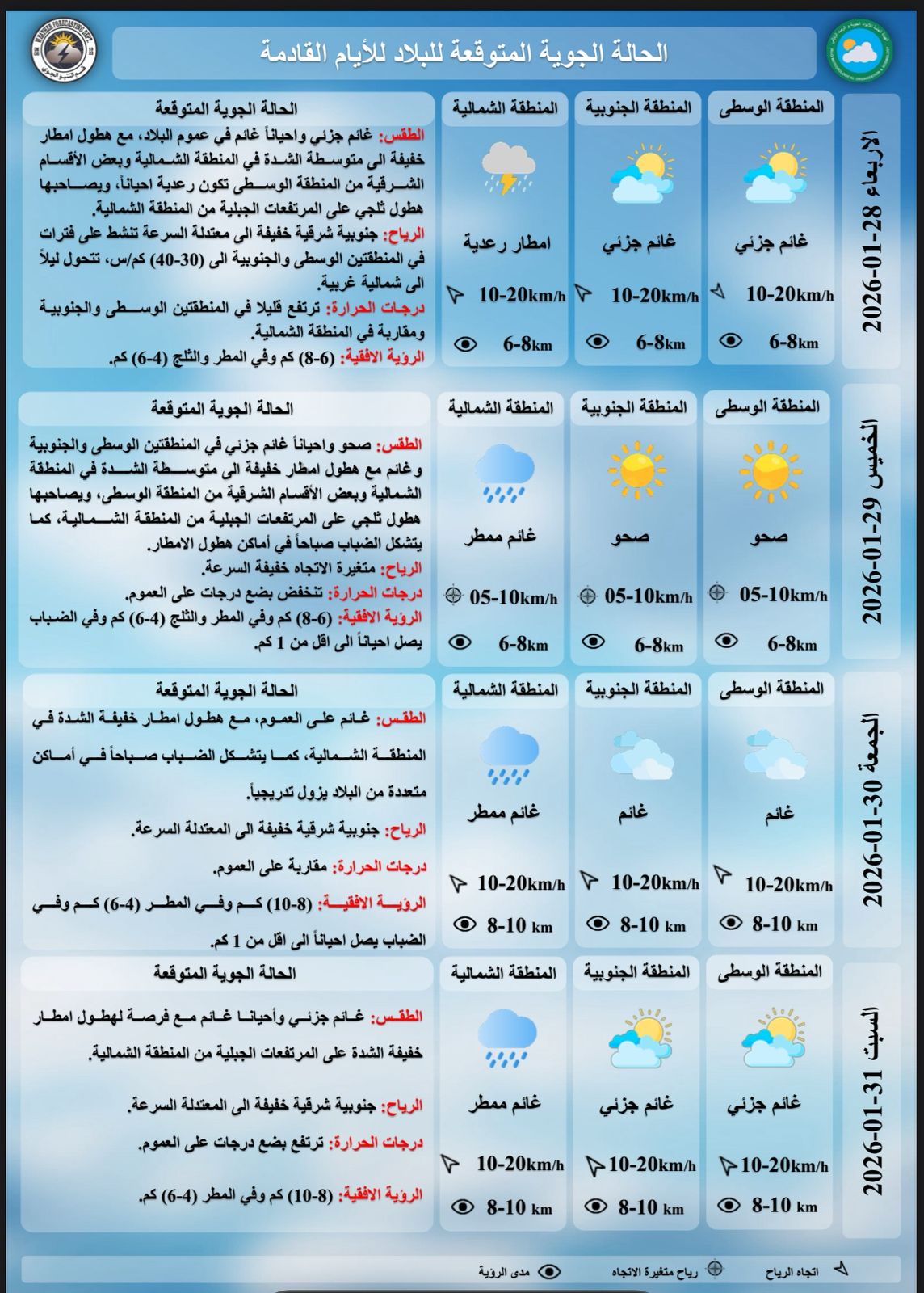 ، ان "طقس يوم غد الأربعاء سيكون غائماً جزئياً وأحياناً غائم في عموم البلاد، مع هطول أمطار خفيفة إلى متوسطة الشدة في
