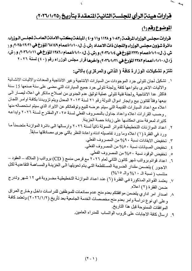 ، اليوم الثلاثاء، دوائر الدولة بتخفيض الإيفاد 90% وتقليص وقود السيارات 50%.