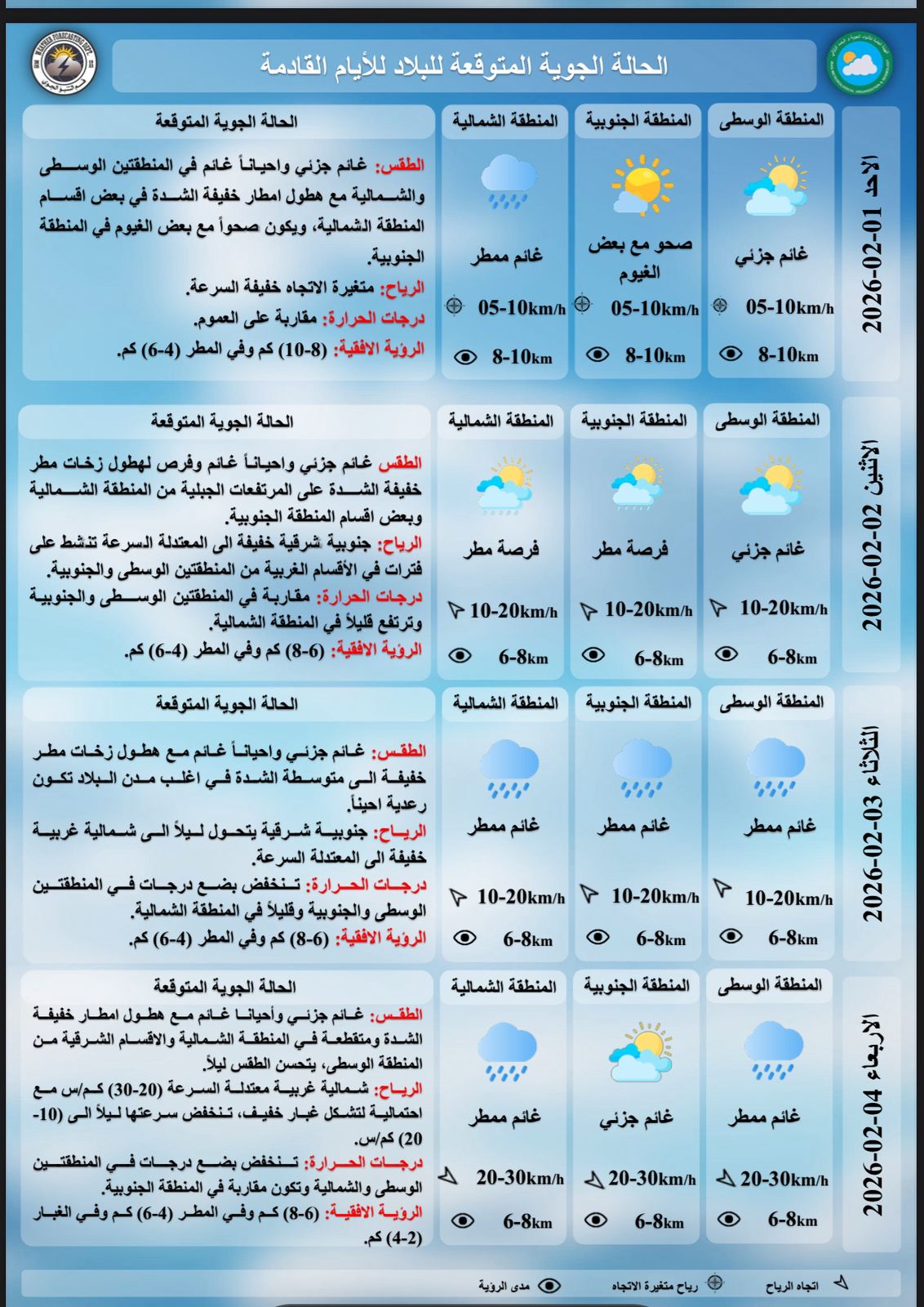 ، أن "طقس يوم غد الأحد سيكون غائماً جزئياً واحياناً غائم في المنطقتين الوسطى والشمالية مع هطول امطار خفيفة الشدة في بعض اقسام