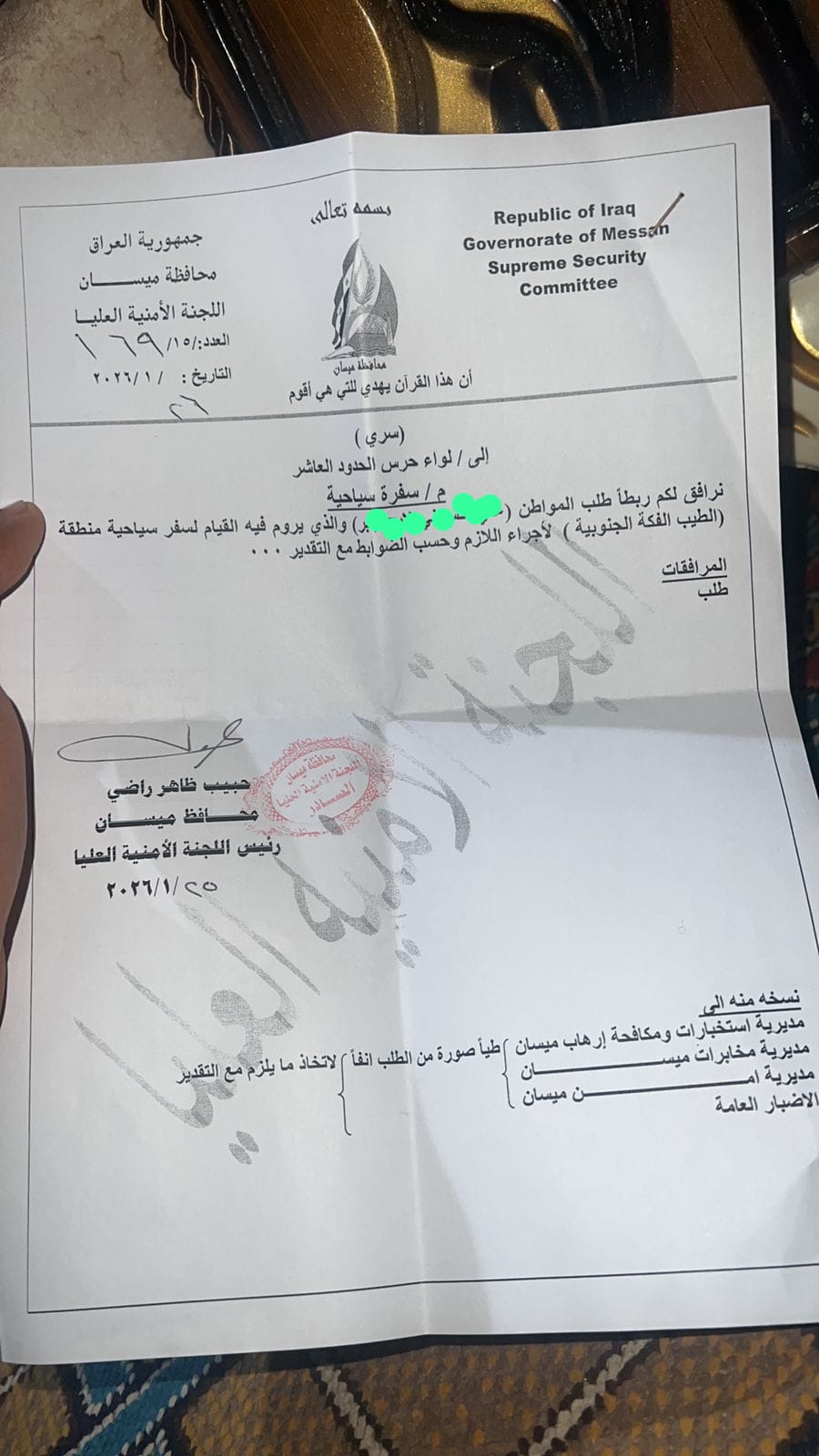 قدم طلب الى المحافظ يتضمن السماح له بزيارة منطقة الفكة الجنوبية بهدف السياحة واتخذ الطرق القانونية في تقديم الطلب"، مبينا ان "رئيس