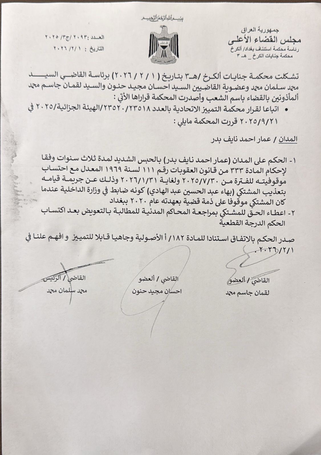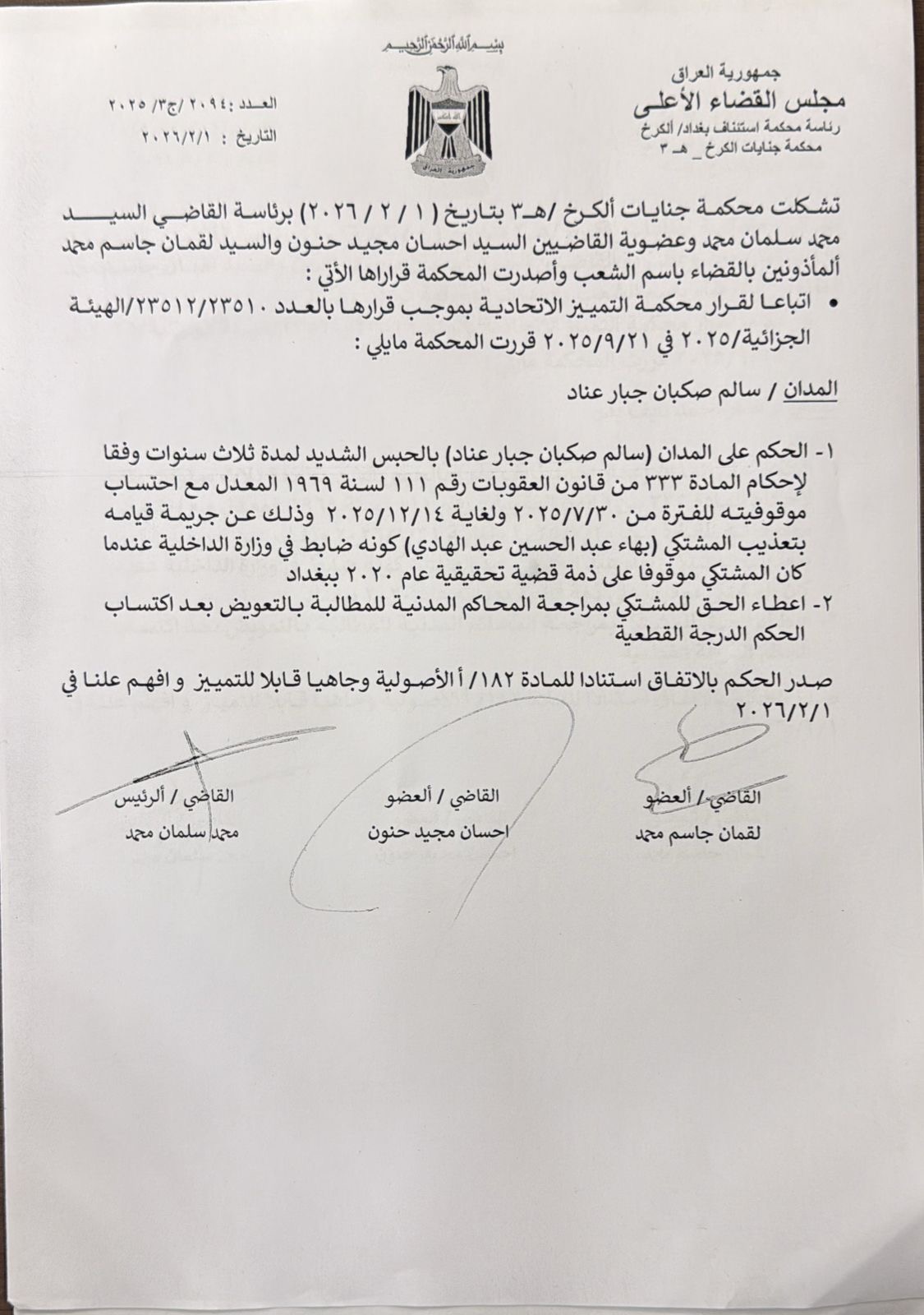 بدر بالحبس الشديد لمدة ثلاث سنوات لكل منهما، وفق أحكام المادة 333 من قانون العقوبات رقم 111 لسنة 1969 المعدل، مع احتساب مدة التوقيف من تاريخ 30 تموز 2025 ولغاية 14 كانون الأول 2025 بالنسبة للأول، ومن 30 تموز 2025 ولغاية 31 كانون الثاني 2026 بالنسبة للثاني.