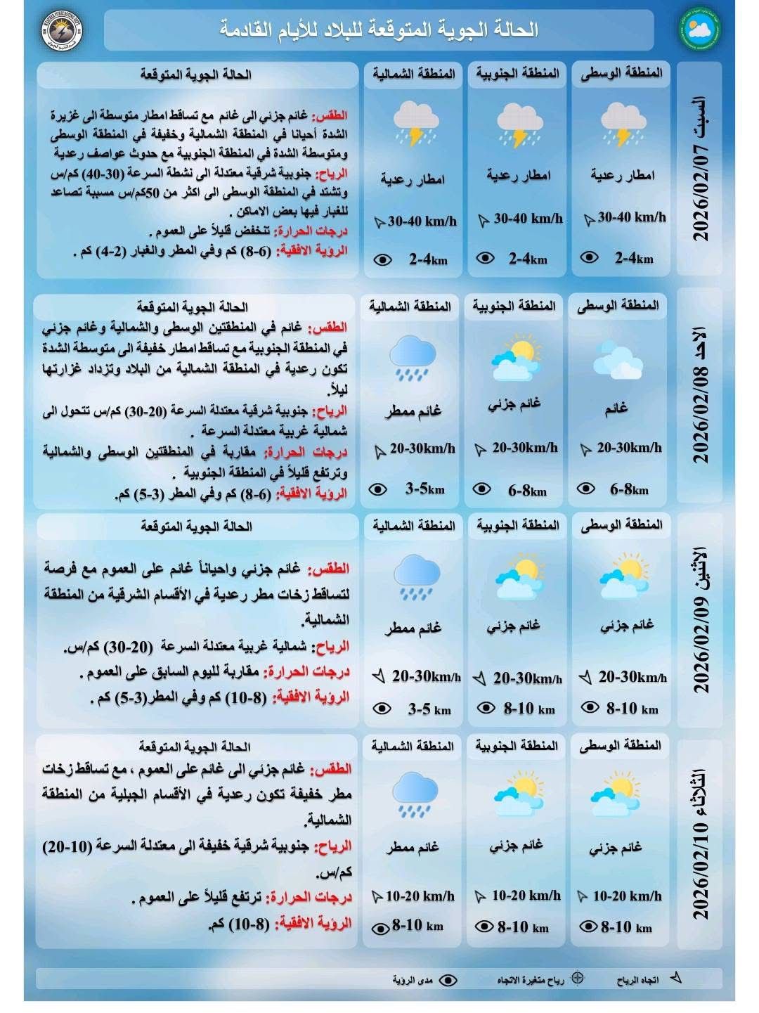 مع حدوث عواصف رعدية مع تصاعد الغبار في بعض الأماكن ودرجات الحرارة تنخفض قليلا"، مبينة ان "طقس يوم الاحد سيكون غائما في المنطقتين الوسطى والشمالية وغائم جزئي في المنطقة الجنوبية مع تساقط امطار خفيفة الى متوسطة الشدة تكون رعدية في المنطقة الشمالية وتزداد غزارتها ليلا ودرجات الحرارة مقاربة في المنطقتين الوسطى والشمالية وترتفع قليلا في المنطقة الجنوبية".