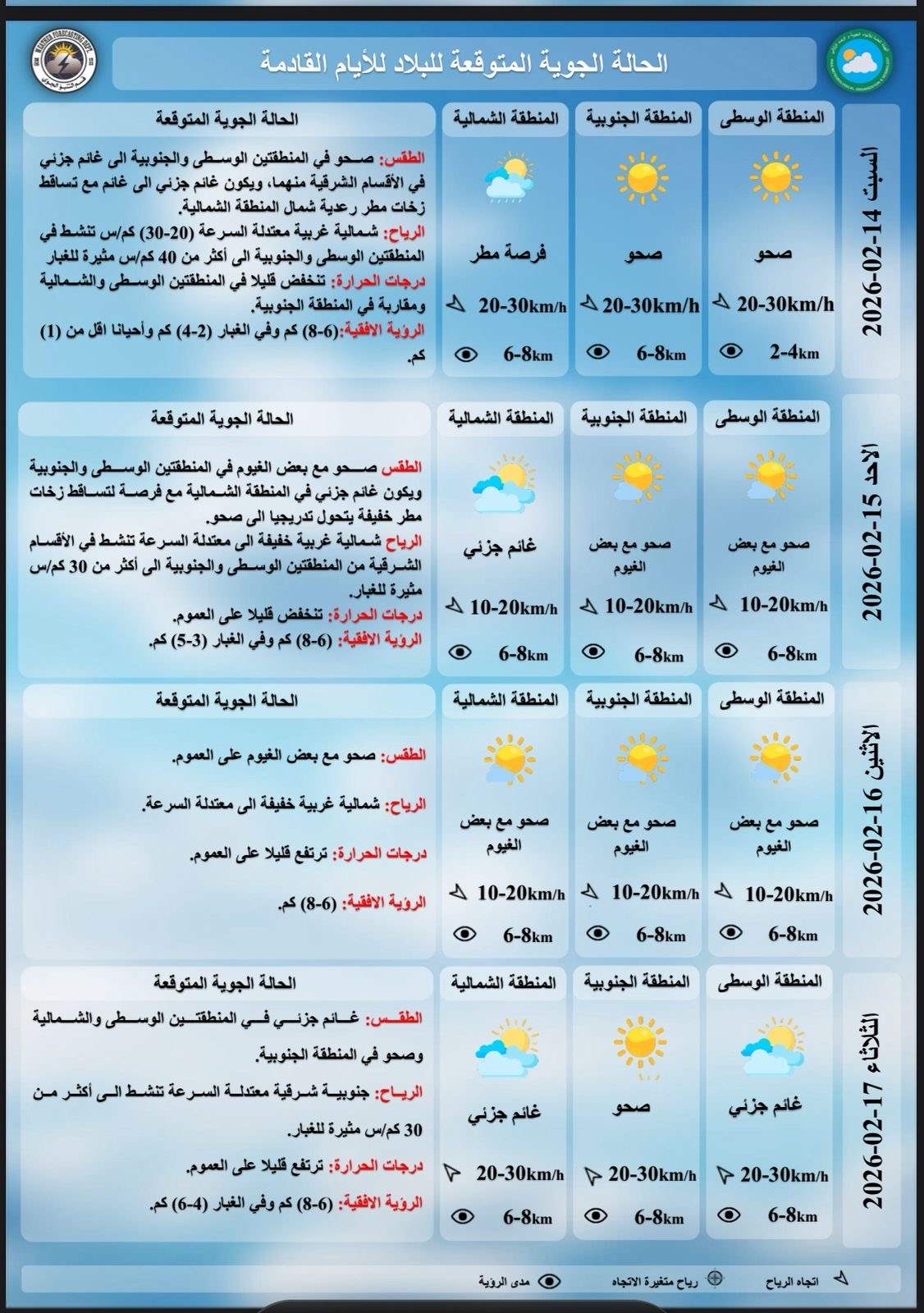 واضافت ان "طقس الاحد سيكون صحوا مع بعض الغيوم في المنطقتين الوسطى والجنوبية، ويكون غائم جزئي في المنطقة الشمالية مع فرصة لتساقط زخات مطر خفيفة يتحول تدريجياً إلى صحو والرياح: شمالية غربية خفيفة إلى معتدلة السرعة تنشط في الأقسام الشرقية من المنطقتين الوسطى والجنوبية إلى أكثر من 30 كم/س مثيرة للغبار ودرجات الحرارة: تنخفض قليلاً على العموم.