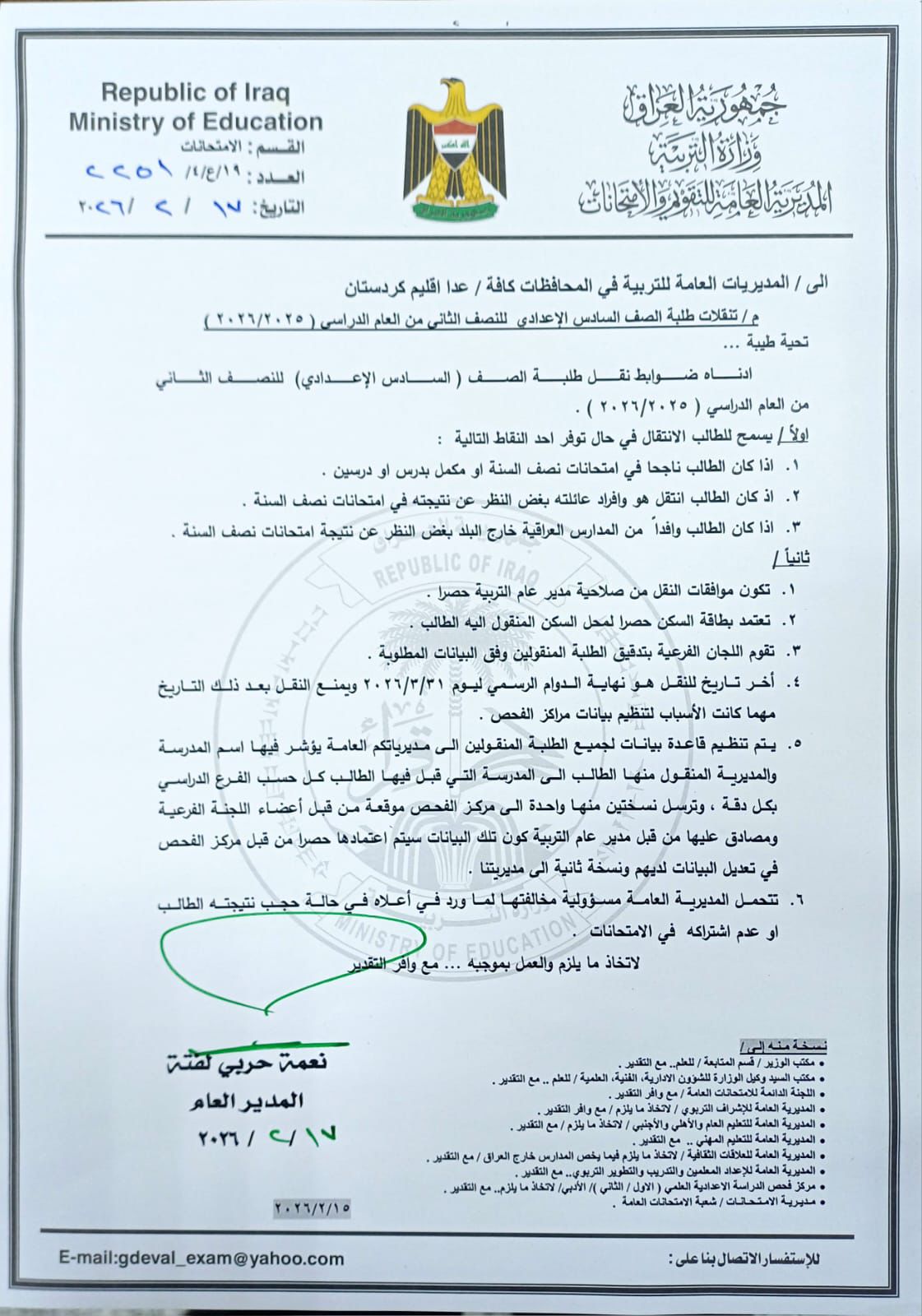 ، اليوم الثلاثاء، عن ضوابط نقل طلبة السادس الإعدادي للنصف الثاني من العام الدراسي 2025_2026.