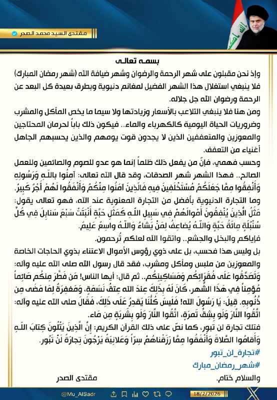 الصدر: لا ينبغي التلاعب بالأسعار وزيادتها