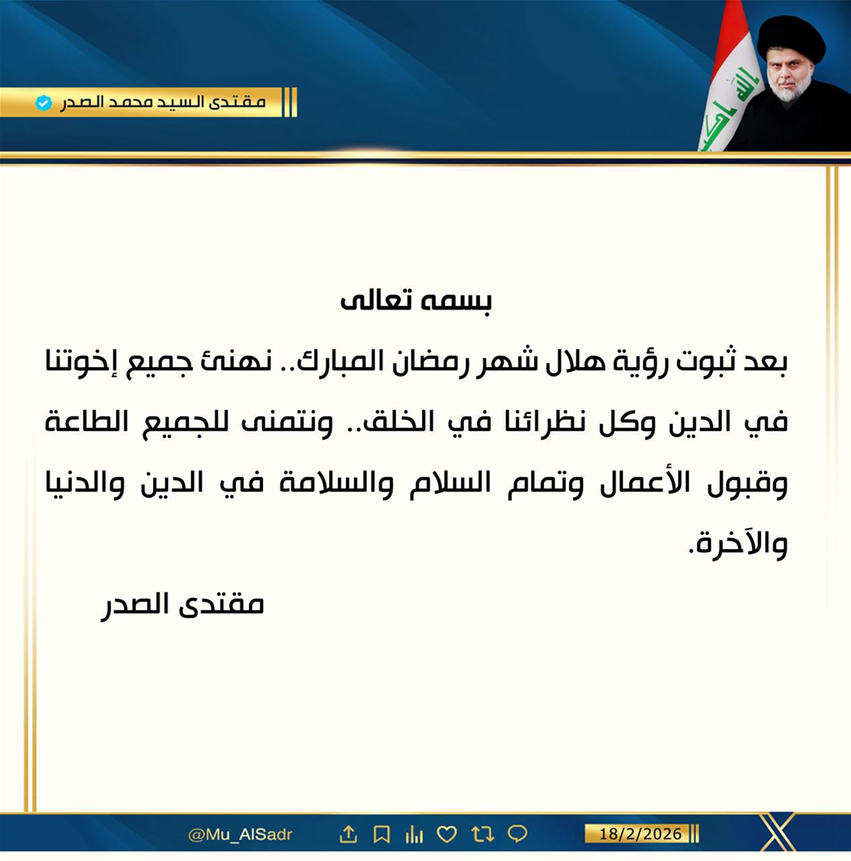السيد الصدر يصدر بيانا بمناسبة ثبوت رؤية هلال رمضان