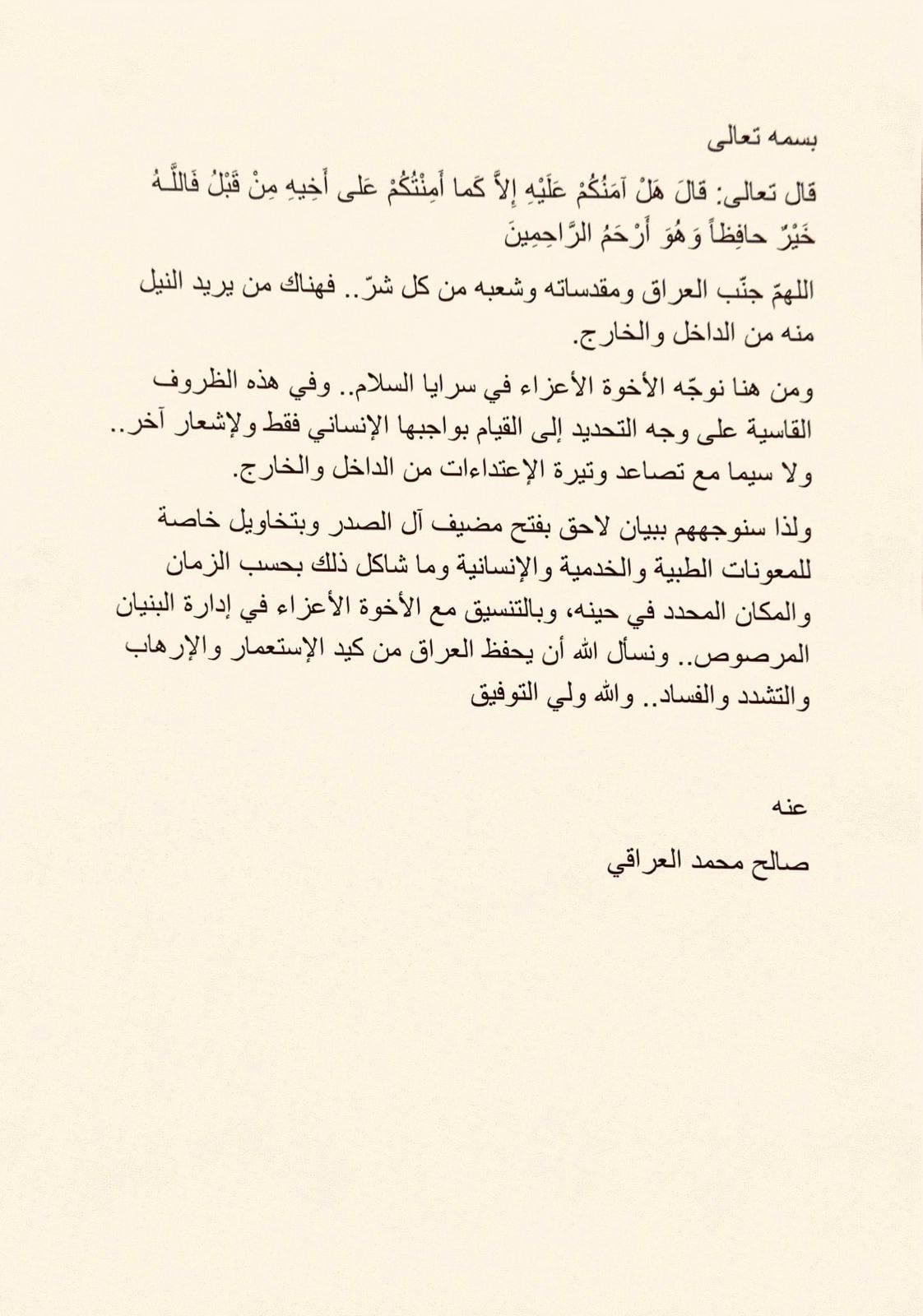 وأضاف "من هنا نوجّه الأخوة الأعزاء في سرايا السلام.. وفي هذه الظروف القاسية على وجه التحديد إلى القيام بواجبها الإنساني فقط ولإشعار آخر.. ولا سيما مع تصاعد وتيرة الإعتداءات من الداخل والخارج".