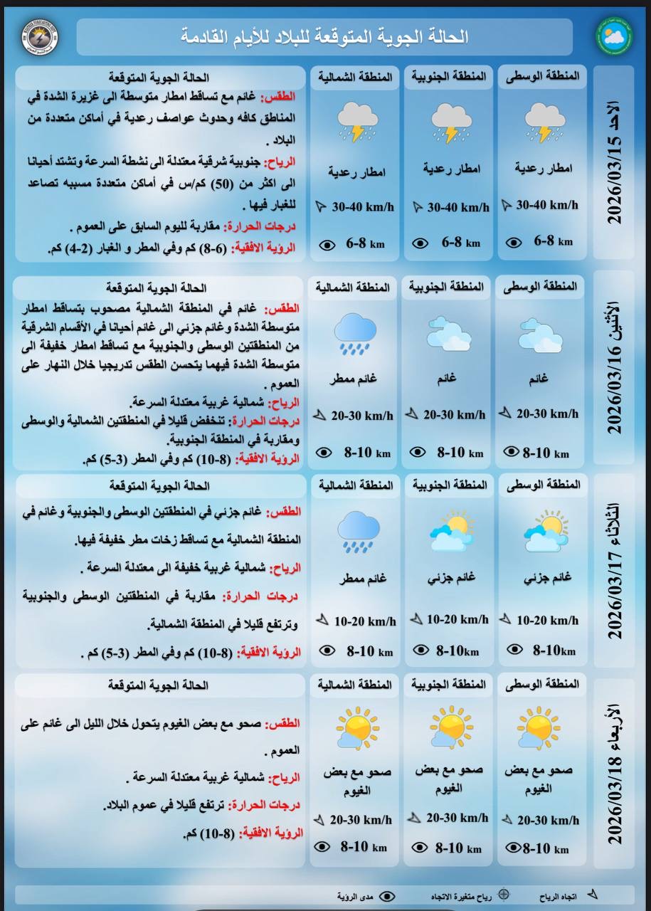 ، ان "طقس يوم غد الاحد سيكون غائما مع تساقط امطار متوسطة إلى غزيرة الشدة في المناطق كافة وحدوث عواصف رعدية في أماكن متعددة من