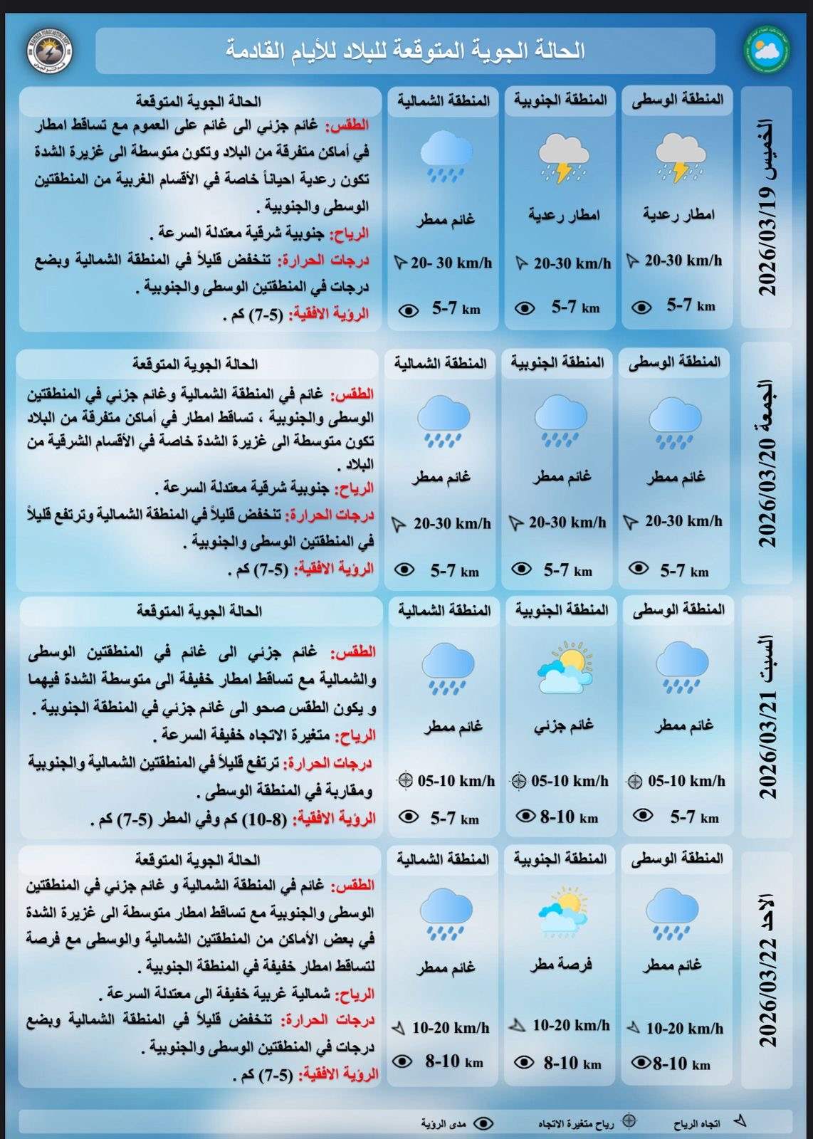، أن "غداً الخميس سيكون الطقس غائماً جزئياً إلى غائم على العموم مع تساقط امطار في اماكن متفرقة من البلاد وتكون متوسطة إلى غزيرة الشدة، وتكون رعدية أحياناً خاصة في الاقسام الغربية من المنطقتين الوسطى والجنوبية، ودرجات الحرارة تنخفض على العموم، والرؤية الافقية (5-7) كم".