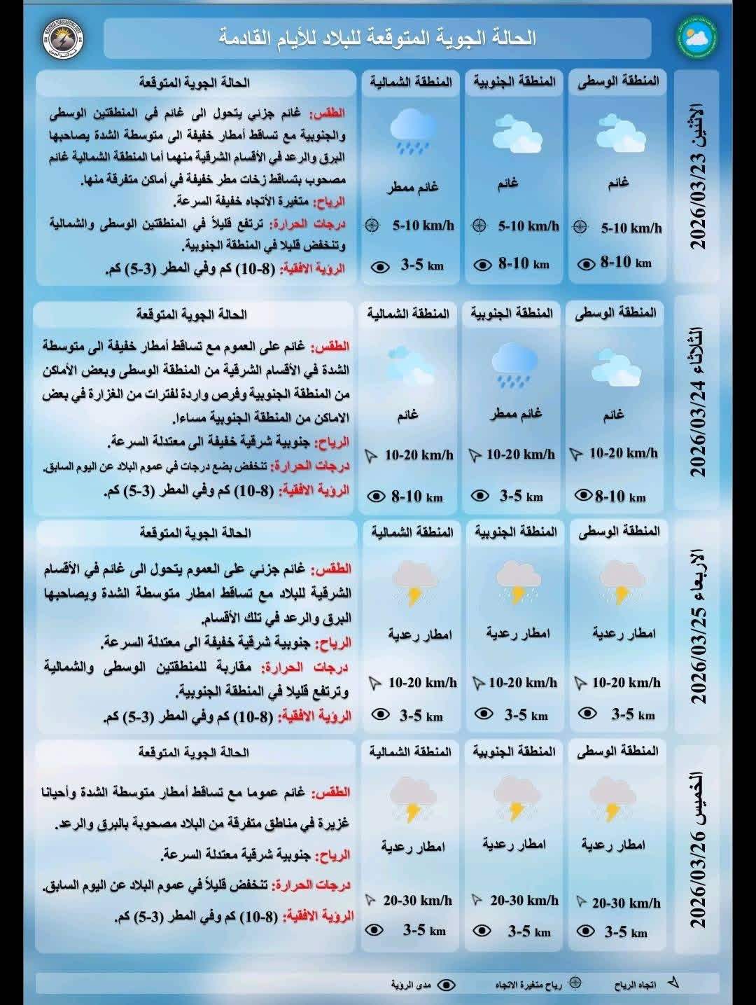 واضافت ان طقس يوم الاربعاء المقبل سيكون غائما جزئيا على العموم يتحول الى غائم في الأقسام الشرقية للبلاد مع تساقط امطار متوسطة الشدة ويصاحبها البرق والرعد في تلك الأقسام ودرجات الحرارة مقاربة للمنطقتين الوسطى والشمالية وترتفع قليلا في المنطقة الجنوبية"، مشيرة الى ان "طقس يوم الخميس المقبل سيكون غائما مع تساقط أمطار متوسطة الشدة وأحيانا غزيرة في مناطق متفرقة من البلاد مصحوبة بالبرق والرعد ودرجات الحرارة تنخفض قليلاً في عموم البلاد عن اليوم السابق".